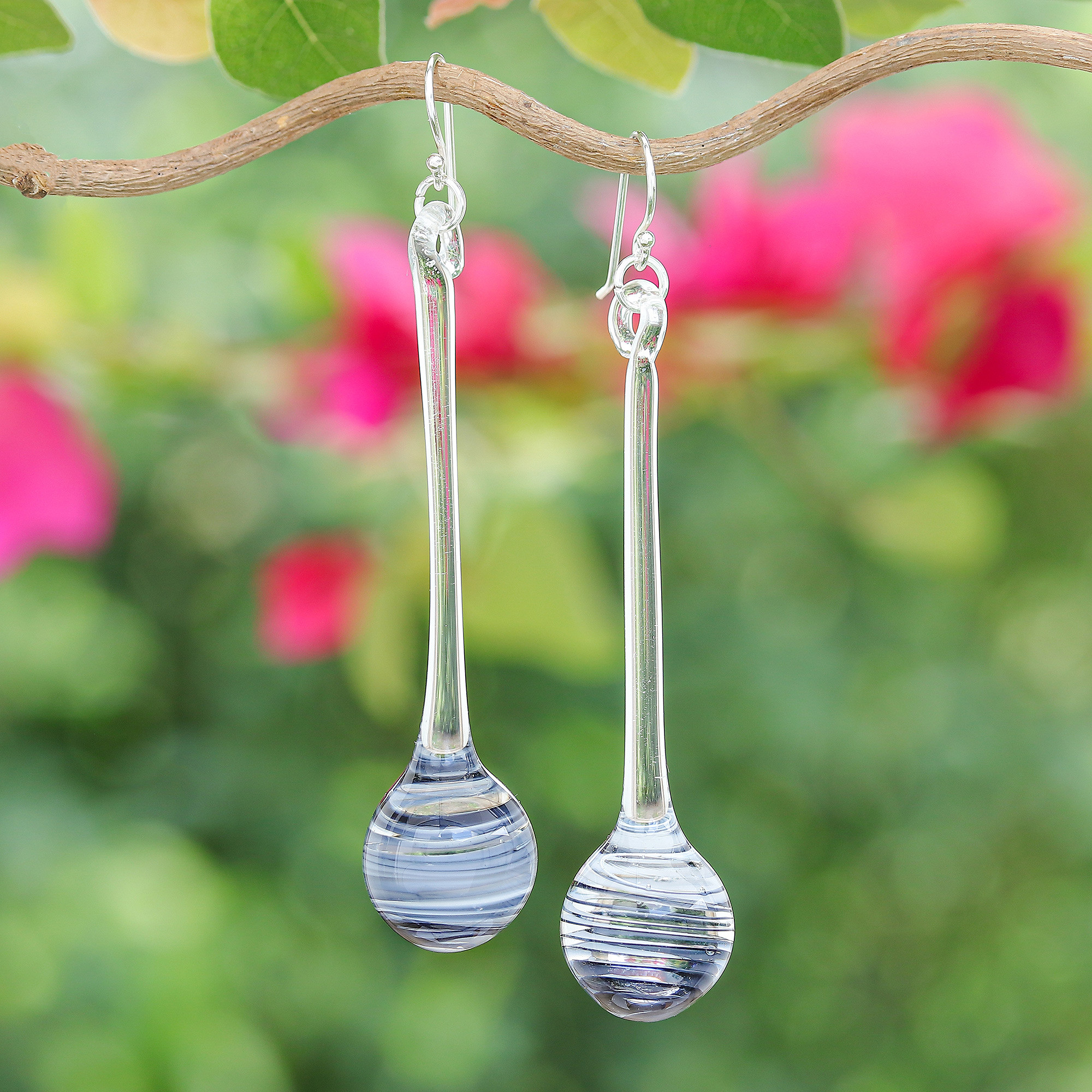 Explore your abstract and modern spirits with this handblown creation by Panapai. The Thai artisan uses traditional techniques to craft this pair of glass dangle earrings, combining clear and black hues on the round bottom drops that embellish the pieces with avant-garde allure. The accessories also come equipped with sterling silver hooks.