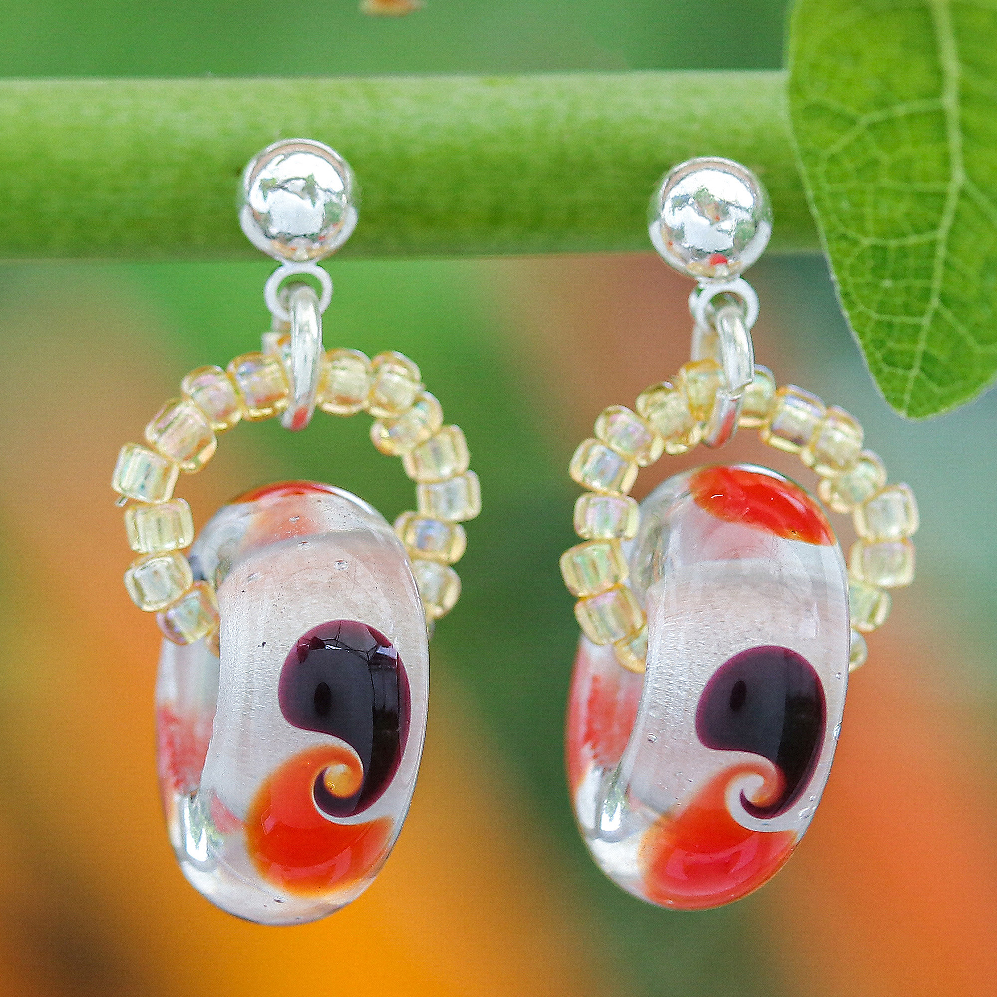 Enter a realm of vibrancy and style with these striking dangle earrings that showcase the beauty of handblown glass in vibrant hues and intricate patterns. Created by Thai artisan Alexx Cheng, they feature gleaming sterling silver posts and delicate glass beads, effortlessly elevating your look with their unique charm.