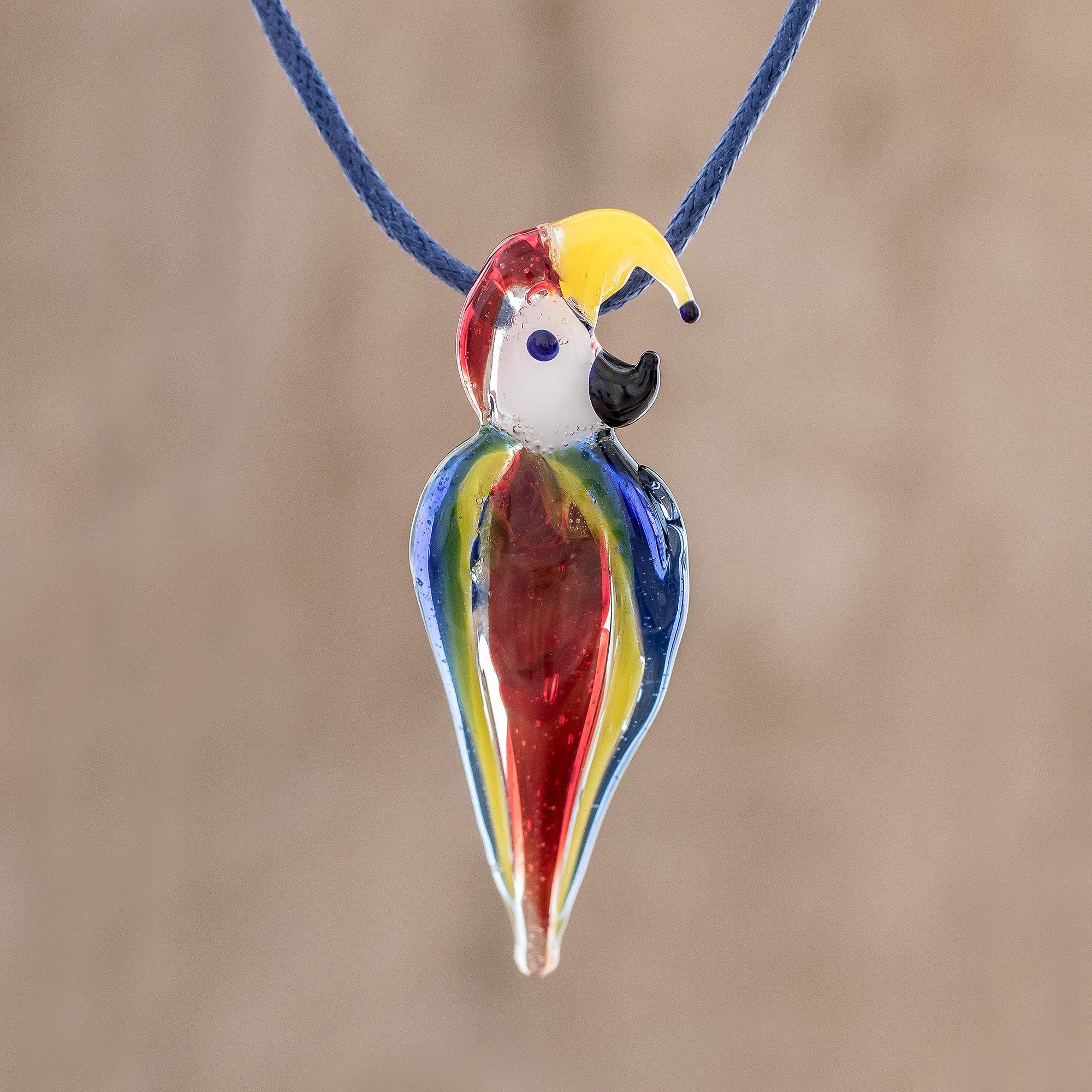 Displaying its beautiful colors, a striking macaw parrot is handblown with a pipette and torch. Crafted by Costa Rican artisan Guisselle Mora, the pendant has tiny air bubbles characteristic of handblown glass. A sliding knot in the blue cotton cord allows the necklace length to be adjusted.
