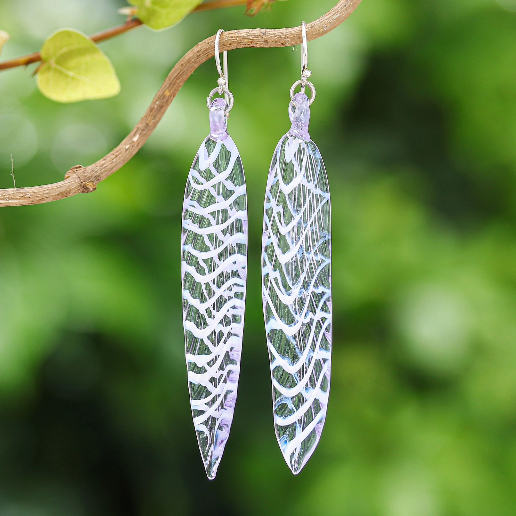 Panapai uses the traditional handblown technique to bring a sublime design to life. After years of learning from the masters about this captivating art, the Thai artisan shows the world his talent and passion with these glass dangle earrings, whose leaf shape, purple hue and white accents transport you to an oneiric dimension. In addition, sterling silver hooks allow you to show the accessories' beauty in all their majesty.