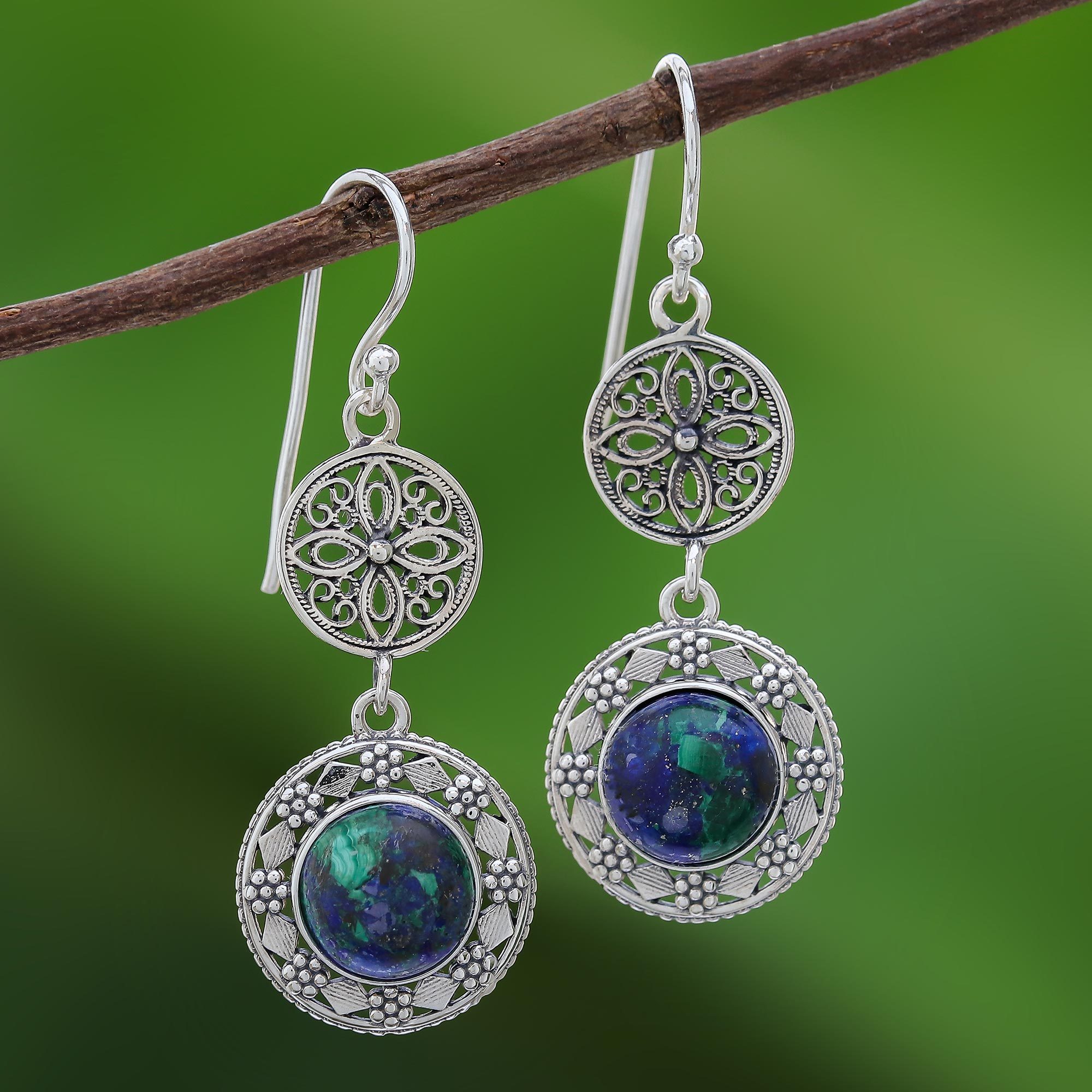 Handcrafted Azure-Malachite and Silver Filigree Earrings, 'Eternal Sea'