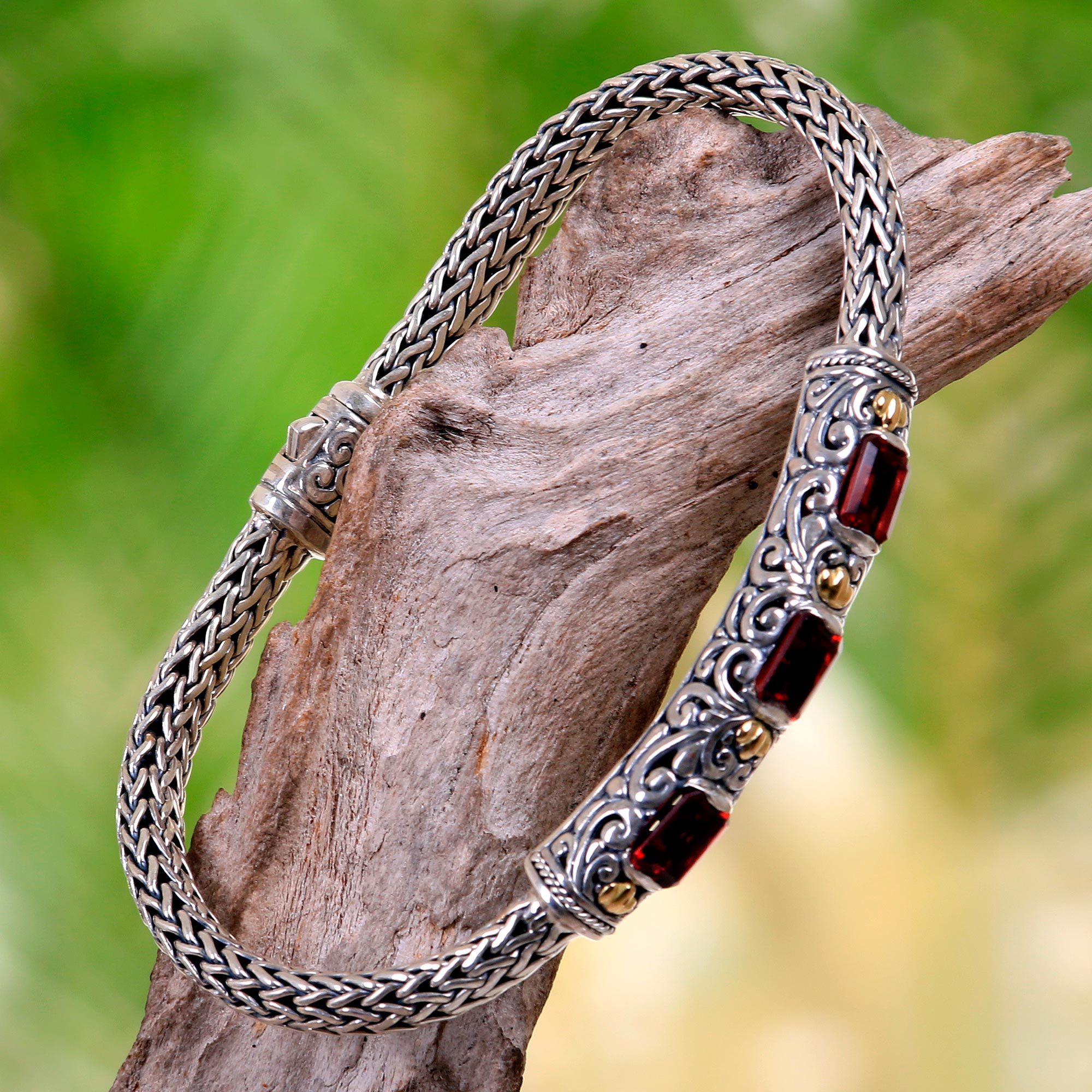 By Wayan Neri, this beautiful bracelet features three faceted garnets. They grace an ornate pendant with traditional Balinese styling that centers a thick sterling silver braid. Tiny globes bathed in 18k gold accentuate the handcrafted bracelet, and the gems total 3.5 carats.