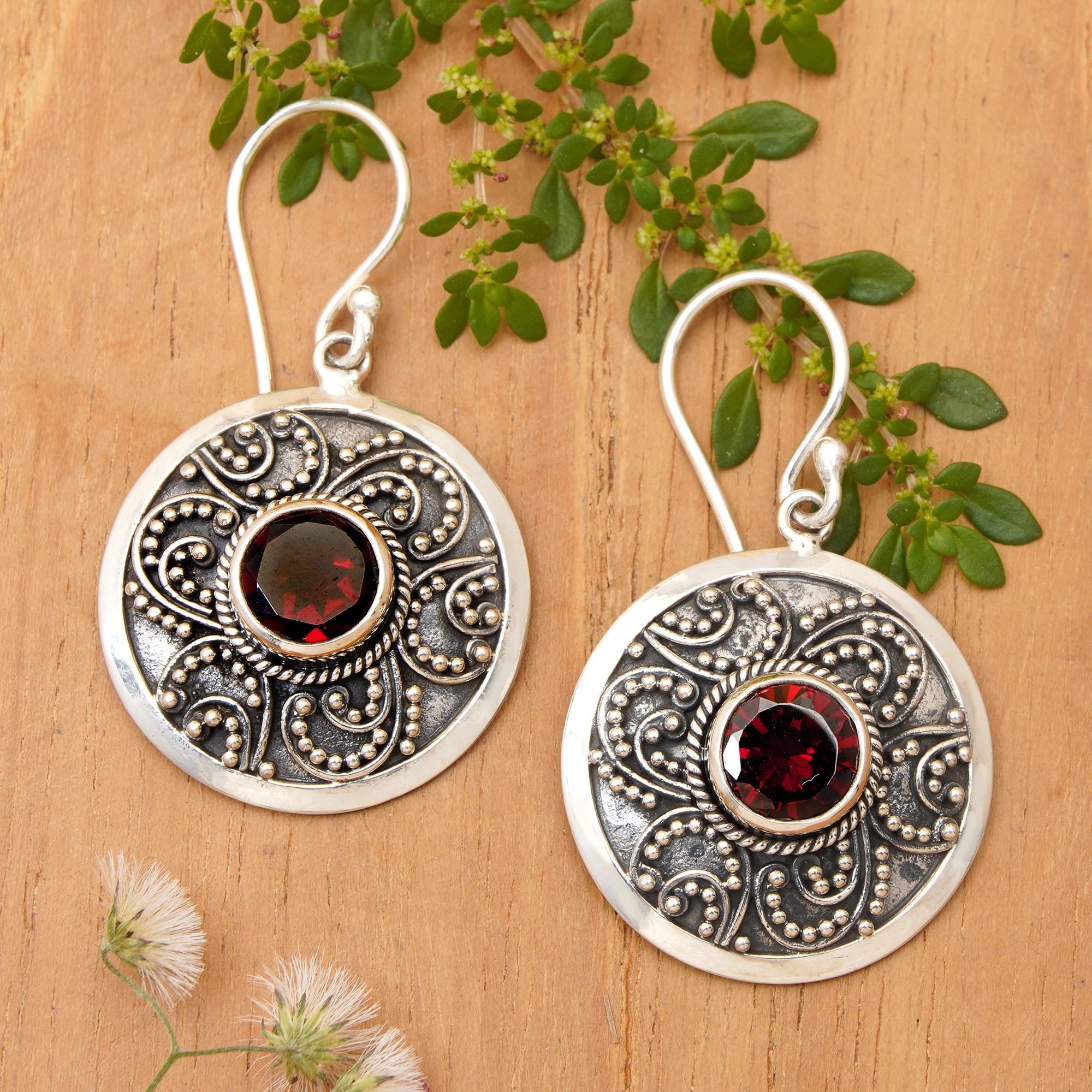 Handcrafted Balinese Sterling Silver Garnet Earrings, 'Balinese Aura'