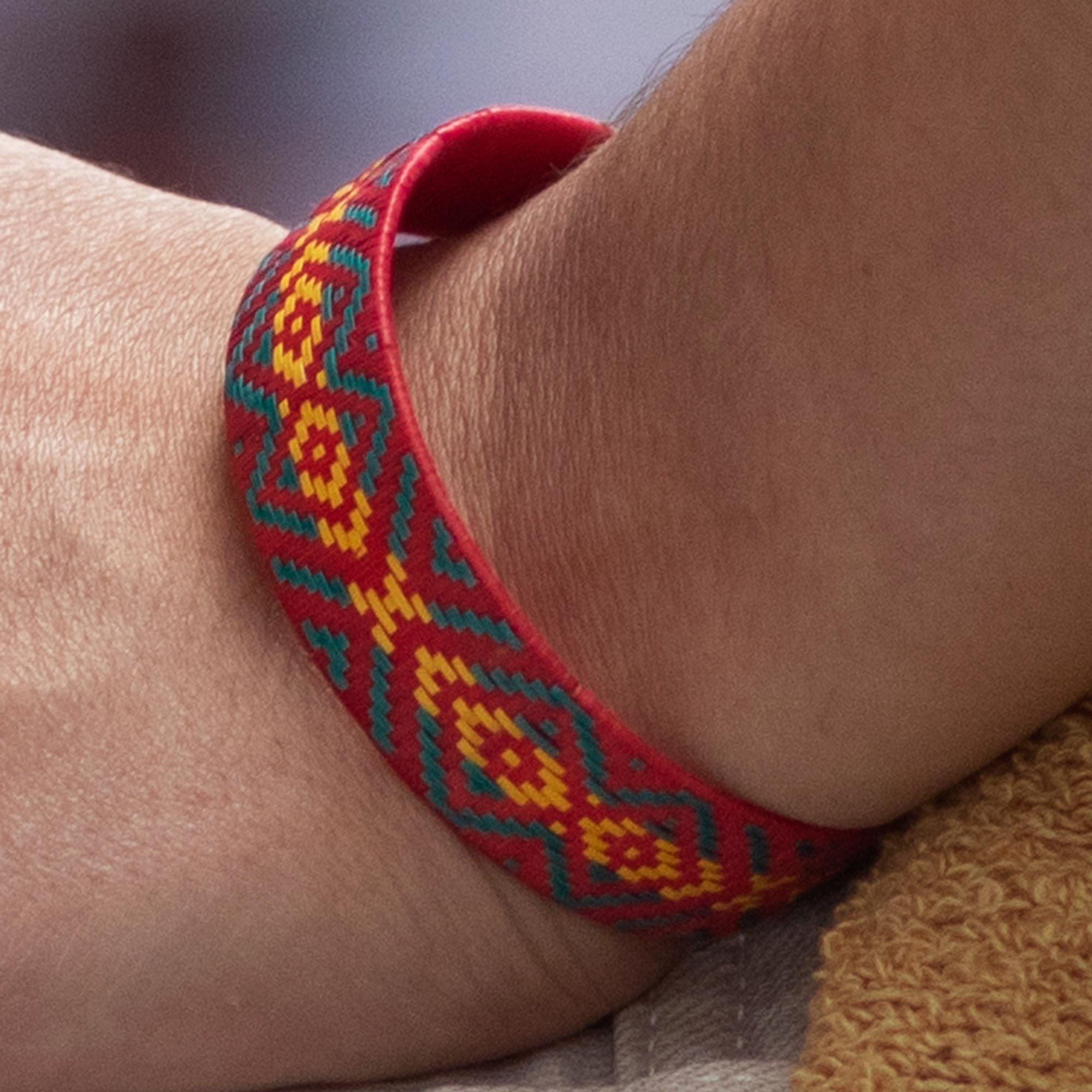 Preserving ancestral techniques and symbology, artisans of the Zenu Community in Colombia craft this colorful cuff bracelet. The cuff starts with a plastic base, which is wrapped with carefully woven caña flecha fibers in red, turquoise and bright yellow. Caña flecha is a neotropical grass native to Colombia and Mexico.
