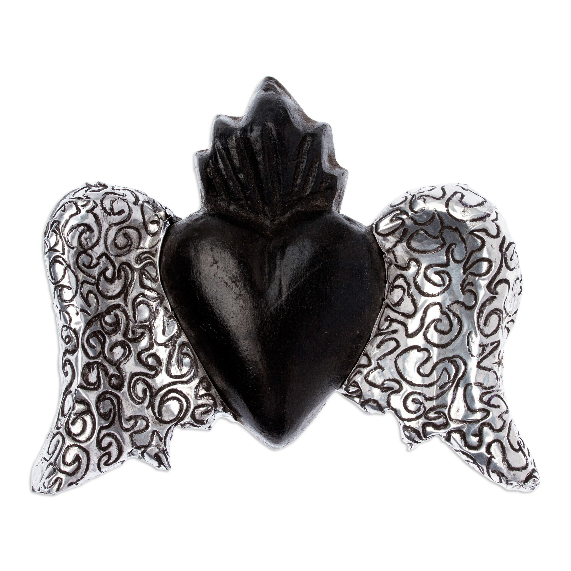 Handcrafted Barro Negro and Aluminum Wall Accent from Mexico, 'Heavenly Heart'