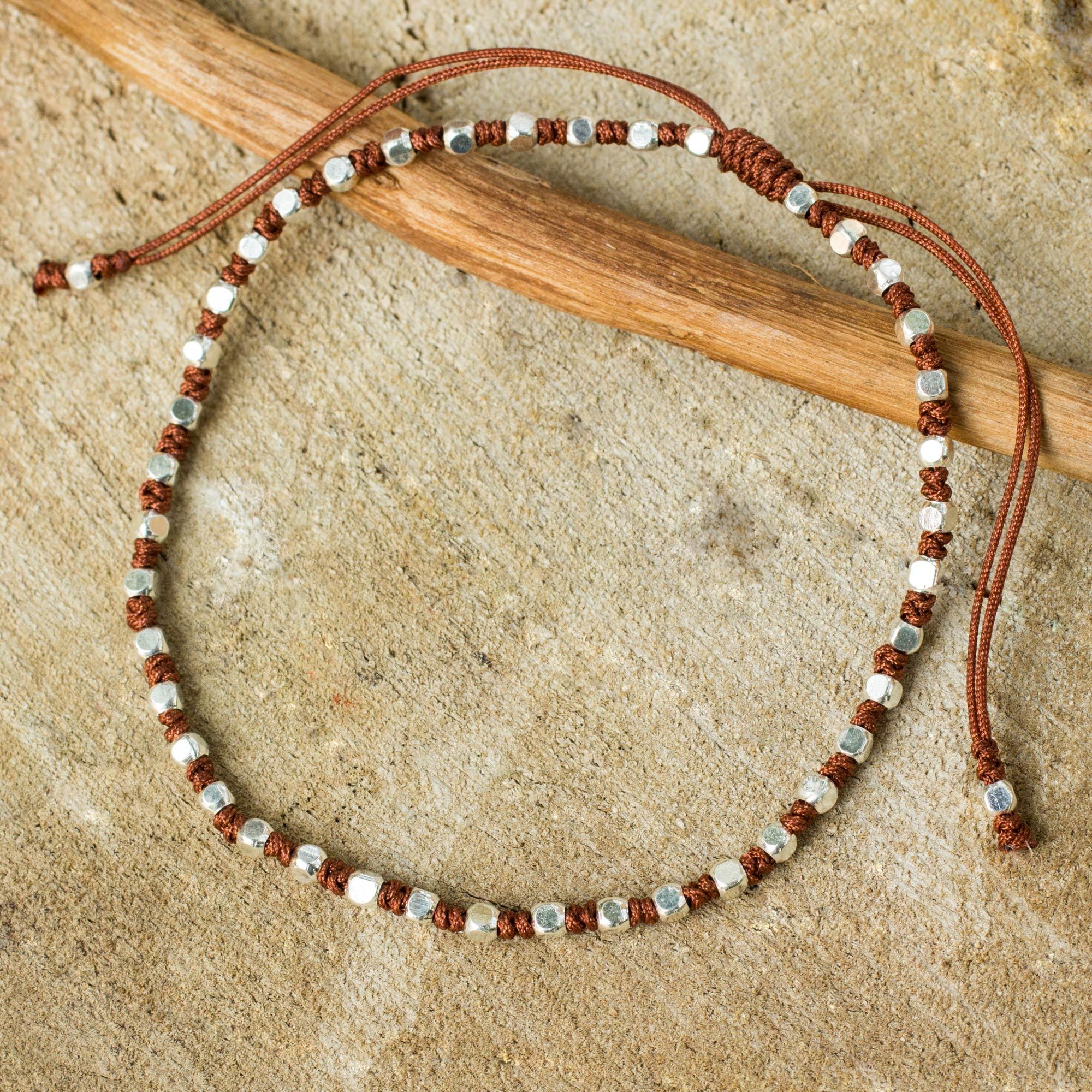 This unique bracelet evokes sparkly glints of frost enlivening a carpet of Autumn leaves. Created by Panapha from Thailand, macramé work in rich brown nylon is the setting for sterling-silver-plated cubes. Fastening with an adjustable slide knot, this pretty bracelet brings the right touch of richness and shine to your favorite casual outfits.