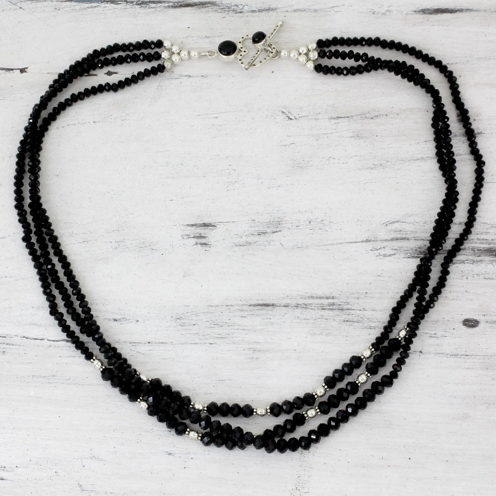 Handcrafted Black Onyx Triple Strand Necklace, 'Ebony Elegance'