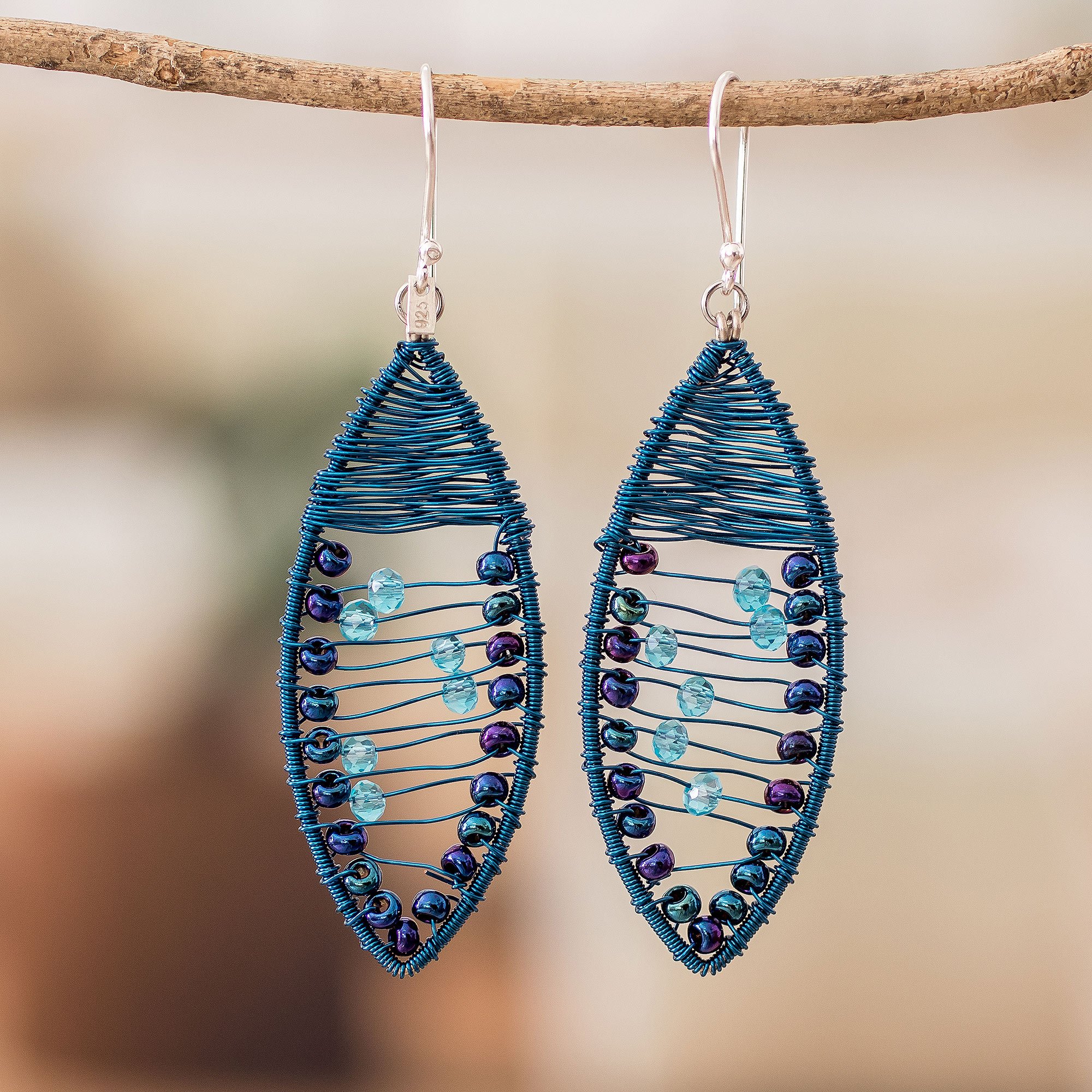 A captivating fusion of petite crystal and glass beads, expertly woven with stainless steel wires into a symphony of blue hues, dangles gracefully from gleaming sterling silver hooks, infusing your style with a touch of elegance. These gorgeous earrings are a testament to Guatemalan artisan Domingo Reanda's skill, offering unparalleled allure and style.