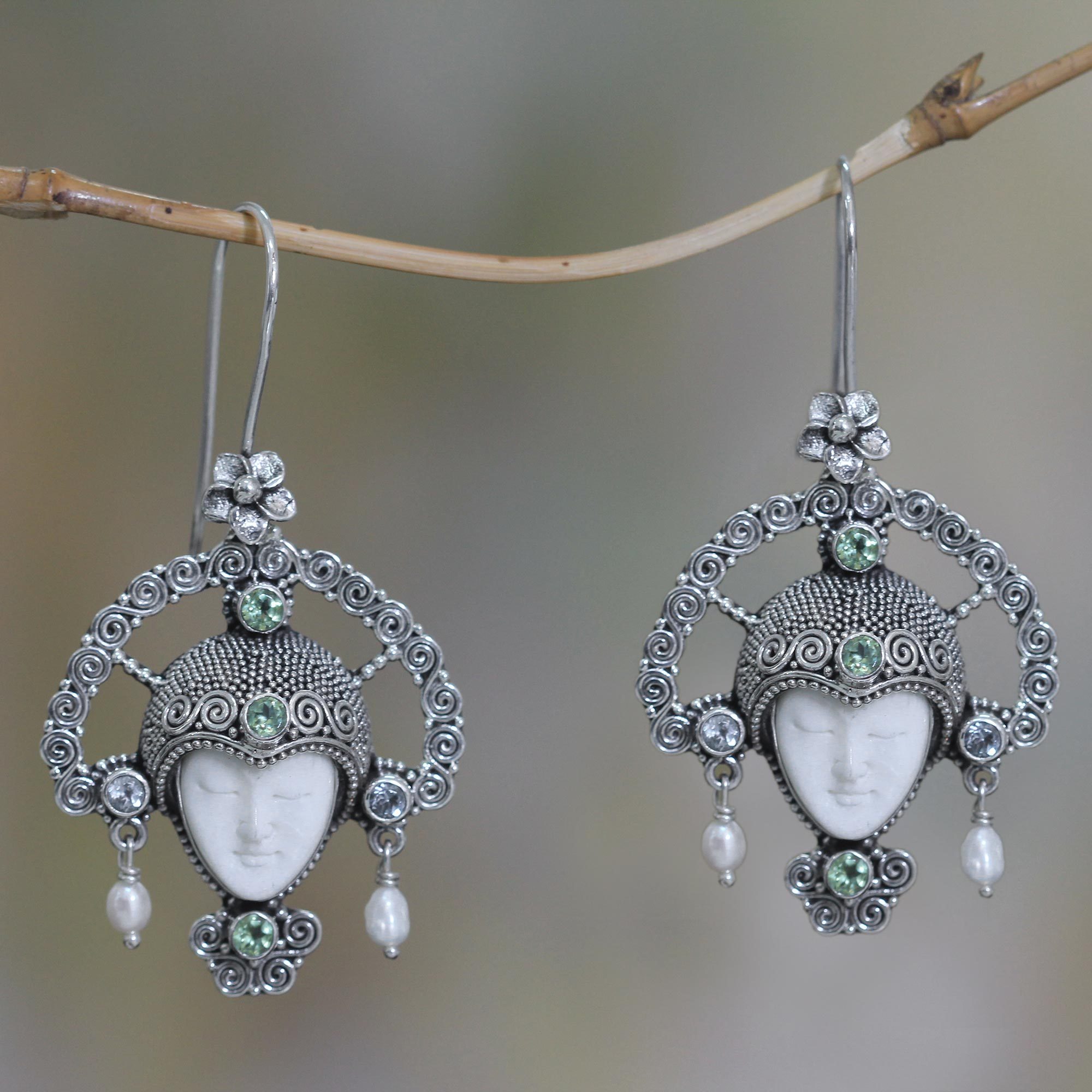 These lovely hand carved earrings are set with 1.10 carats of glittering gemstones. By Buana from Indonesia, these earrings combine beautifully carved cow bone with plumeria designs, and peridot and blue topaz gemstones.