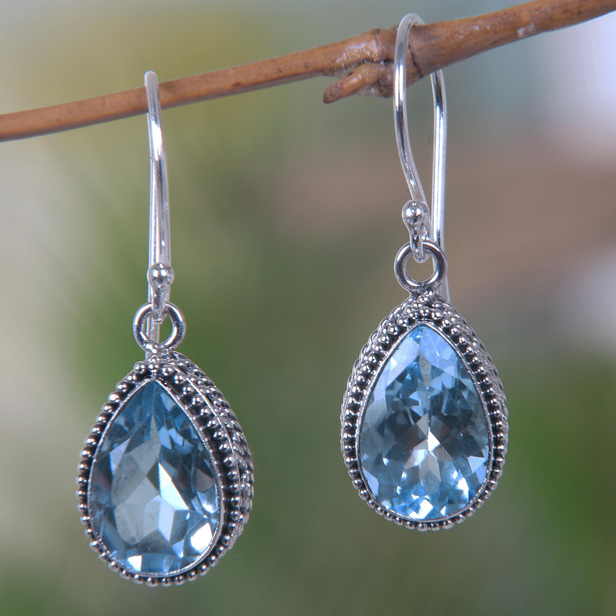 Faceted blue topaz teardrops sparkle within aframe of sterling silver jawan granulation, atraditional Balinese technique. December´s birthstone, the pair of blue topaz gems totals seven carats. Handcrafted in Indonesia by Komang Wijayana.