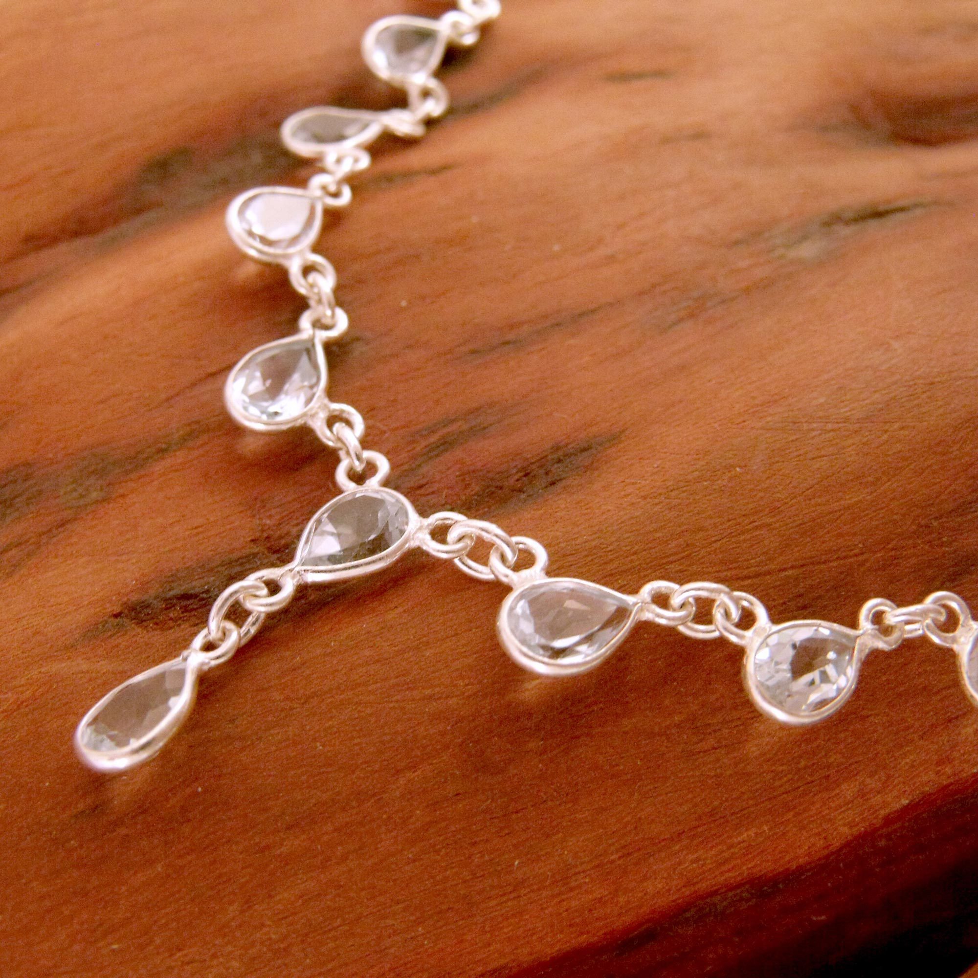 Spiritual rejuvenation is the theme of this necklace, which mimics the appearance of glistening raindrops. Presented by Bhavesh from India, this beautiful necklace features blue topaz droplet charms linked with sterling silver. An unforgettable piece which can accent any wardrobe.