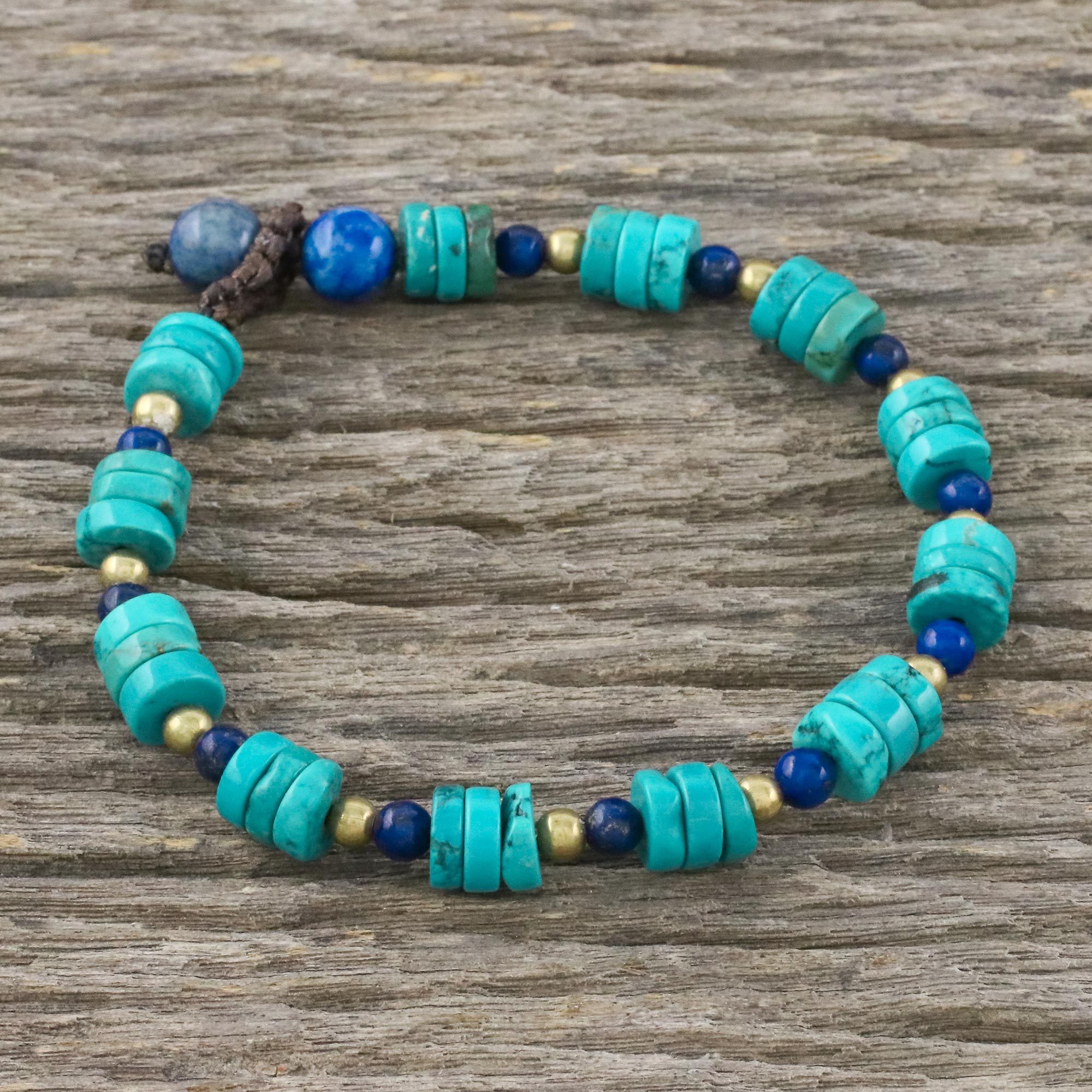 Beautiful beads of lapis lazuli are accompanied by the blue-green aquatic hues of calcite, circling the wrist in this beaded bracelet from Thailand. Designed and crafted by Tiraphan Hasub, the design is completed with petite brass beads that alternate with the lovely gemstone beads. Two lapis buttons give it an adjustable length.