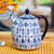 Delicate azure blossoms and stars frolic with geometric motifs in shades of blue. By Mexican artisan Javier Servin, this exquisite pot to serve coffee is handcrafted of high-fired ceramic.
