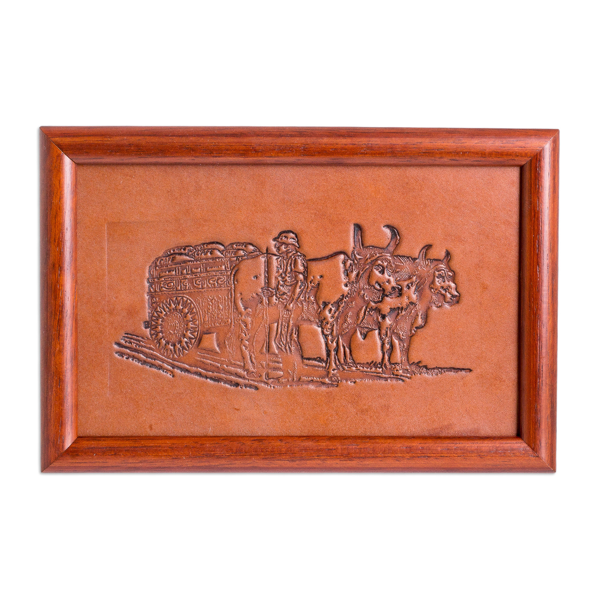 Handcrafted Classic Pinewood-Framed Leather Wall Art, 'Rustic Wagon'