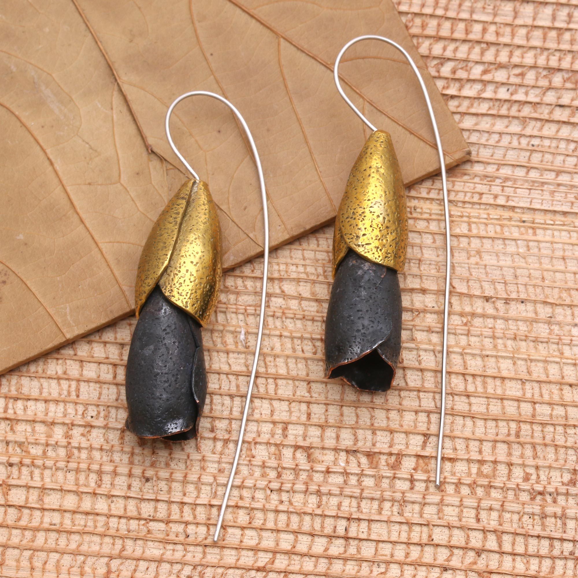 Dark copper rosebuds each arise from its golden brass calyx. Exalting their intriguing textures, Agus Suryanto creates these new and elegant earrings with long, stainless steel hooks.
