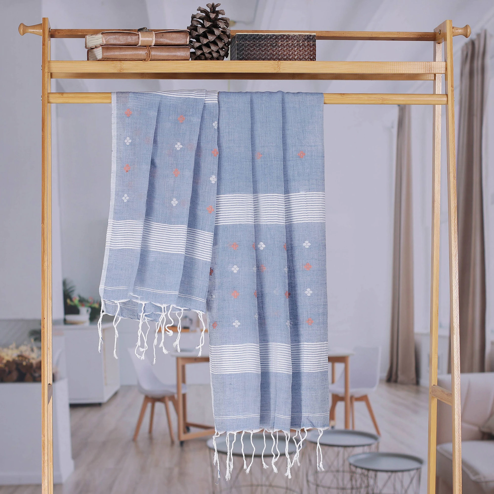India's Aftab designs and crafts this wonderful muslin shawl using the traditional jamdani hand-weaving technique. The artisan uses red-orange and white Ghicha silk yarn to craft the floral pattern that dots the shawl's steel blue cotton base. A row of fringe on either end adds a touch of effortless fun.