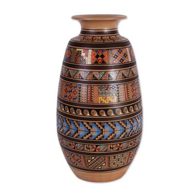 Emotive Andean designs sweep across this vase in precise bands of varied colors, the resulting effect an intoxicating expression of Peruvian artistry. The Huaman Paucar family crafts the piece entirely by hand, beginning with the potter's wheel and culminating with extraordinarily painted details. Geometric figures dominate the perfect glaze, while scrolls and proud llama silhouettes make sparse appearances. Shaped from local clay, the work offers ceramic drama to any décor. Pisac is a town in the state of Cuzco.