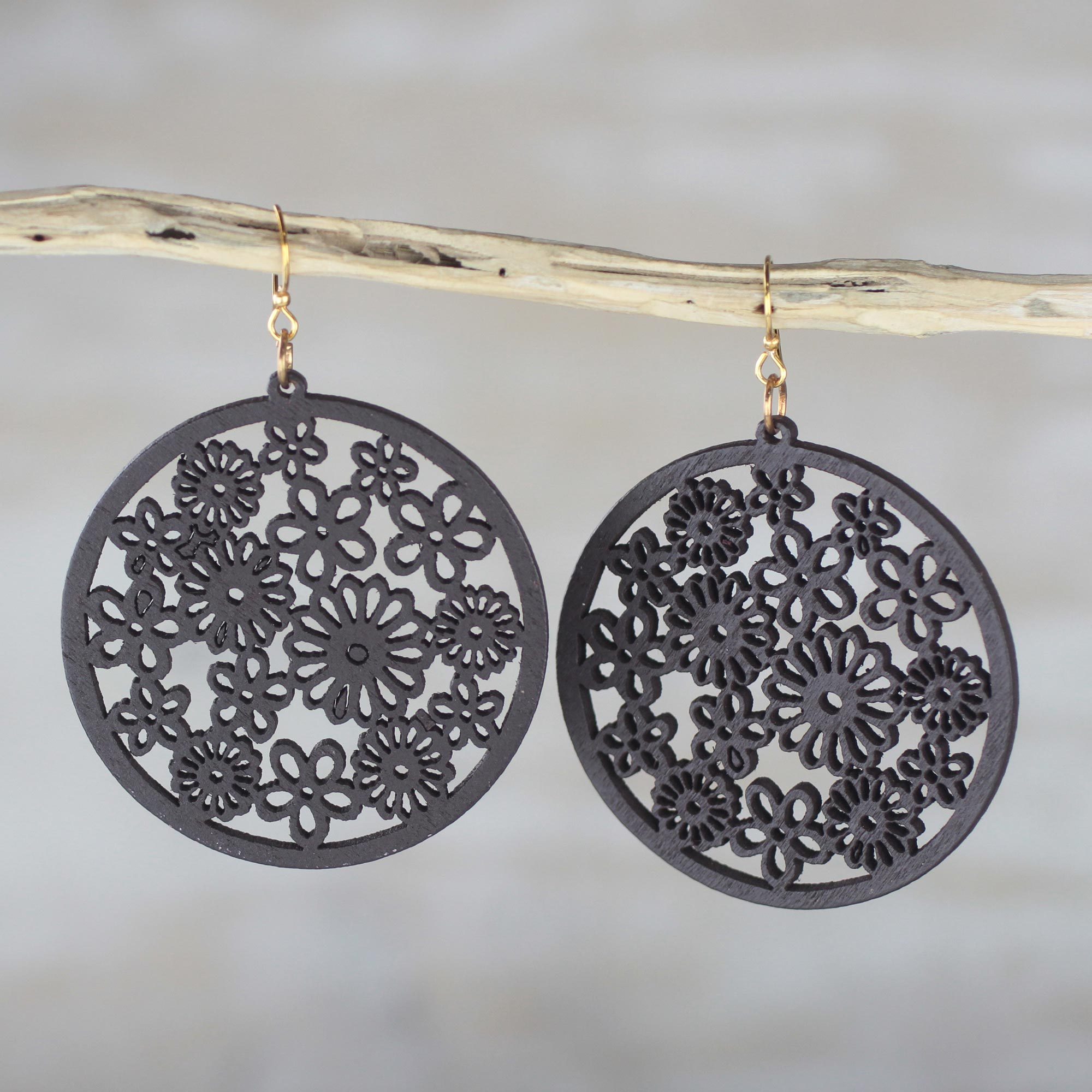 Handcrafted Ebony Wood Floral Motif Circle Dangle Earrings, 'Ebony Bouquet'