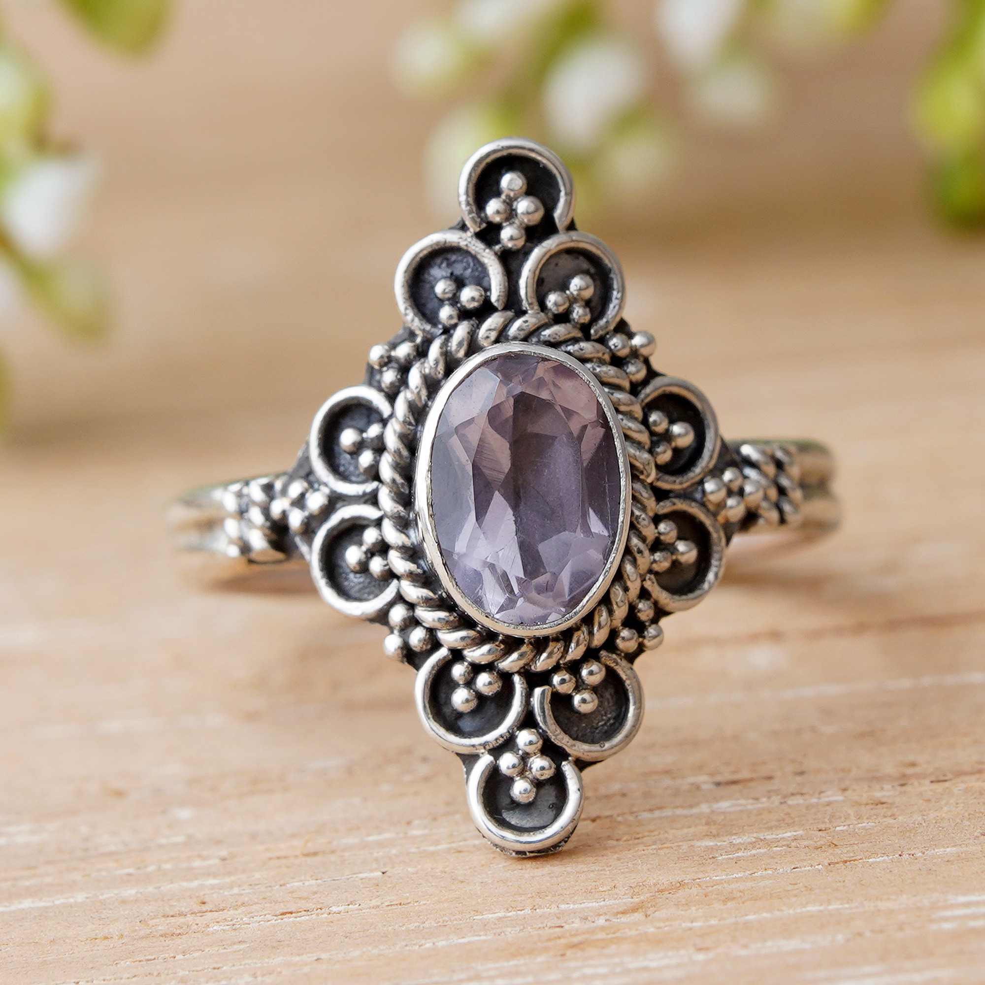 For a dreamy accessory to add to your wardrobe, this cocktail ring is designed by Bali's Ketut Sulastri. She handcrafts the ring of sterling silver with an intricate crown that is centered by an oval cabochon of sparkling faceted amethyst.