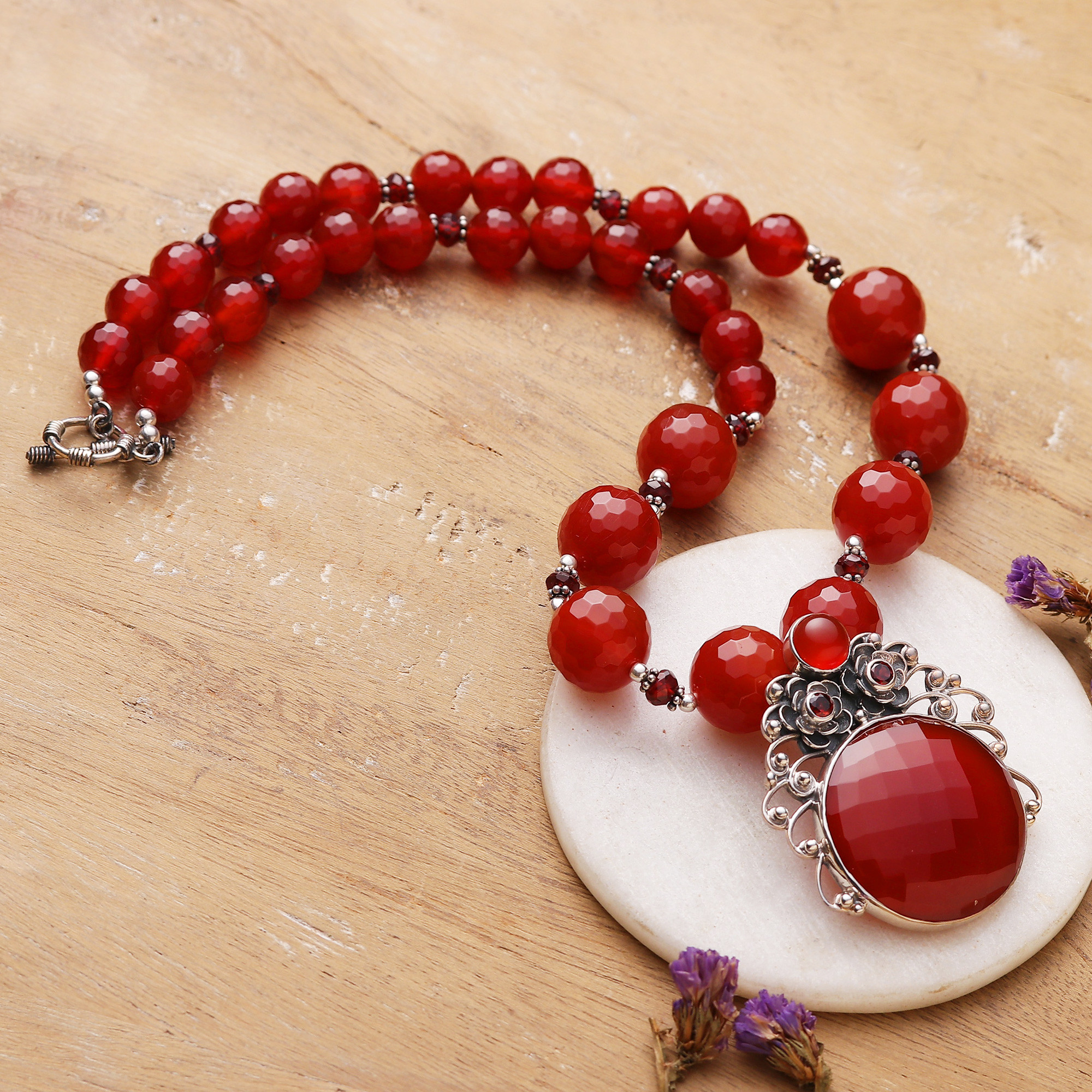 Handcrafted Floral Pendant Necklace Carnelian and Garnet, 'Mystical Blossom'