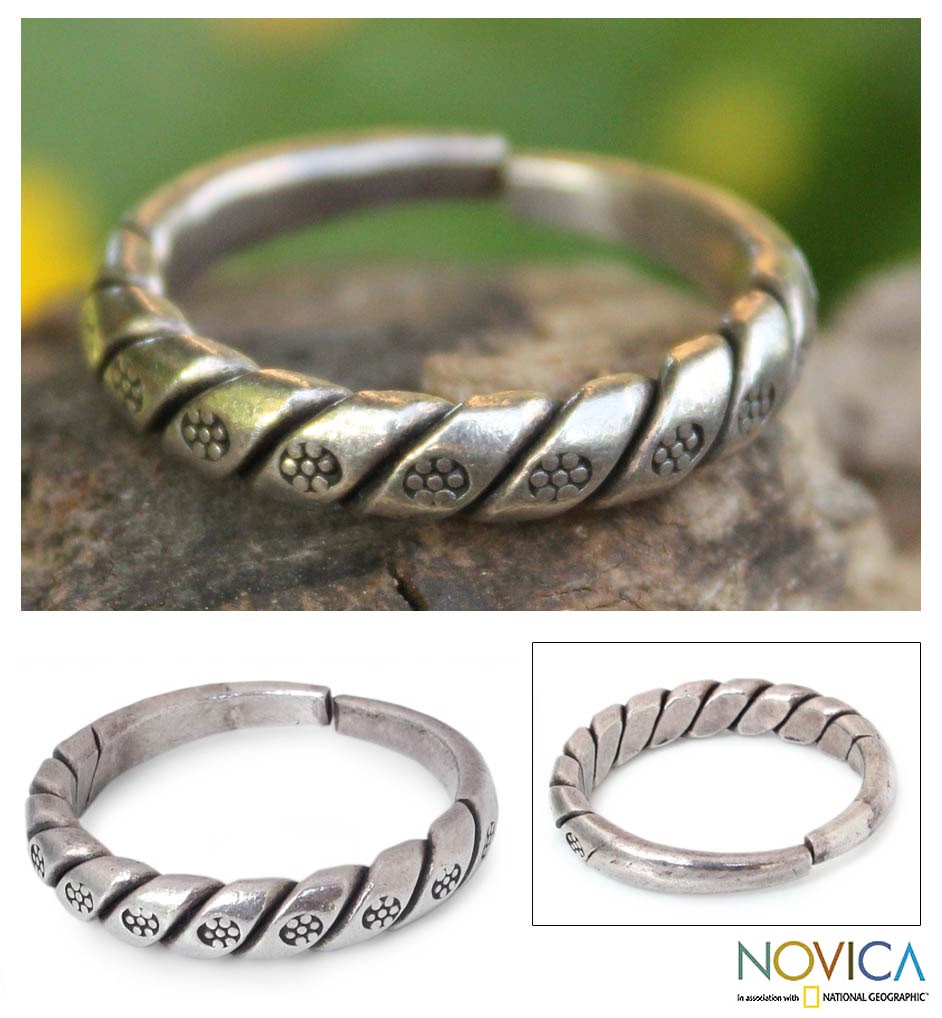 From Achara, this elegant design suggests an opulent silver coil. Each segment hosts a diminutive jasmine blossom. The handcrafted ring exemplifies the traditional artistry of Thailand's hill tribe silversmiths.
