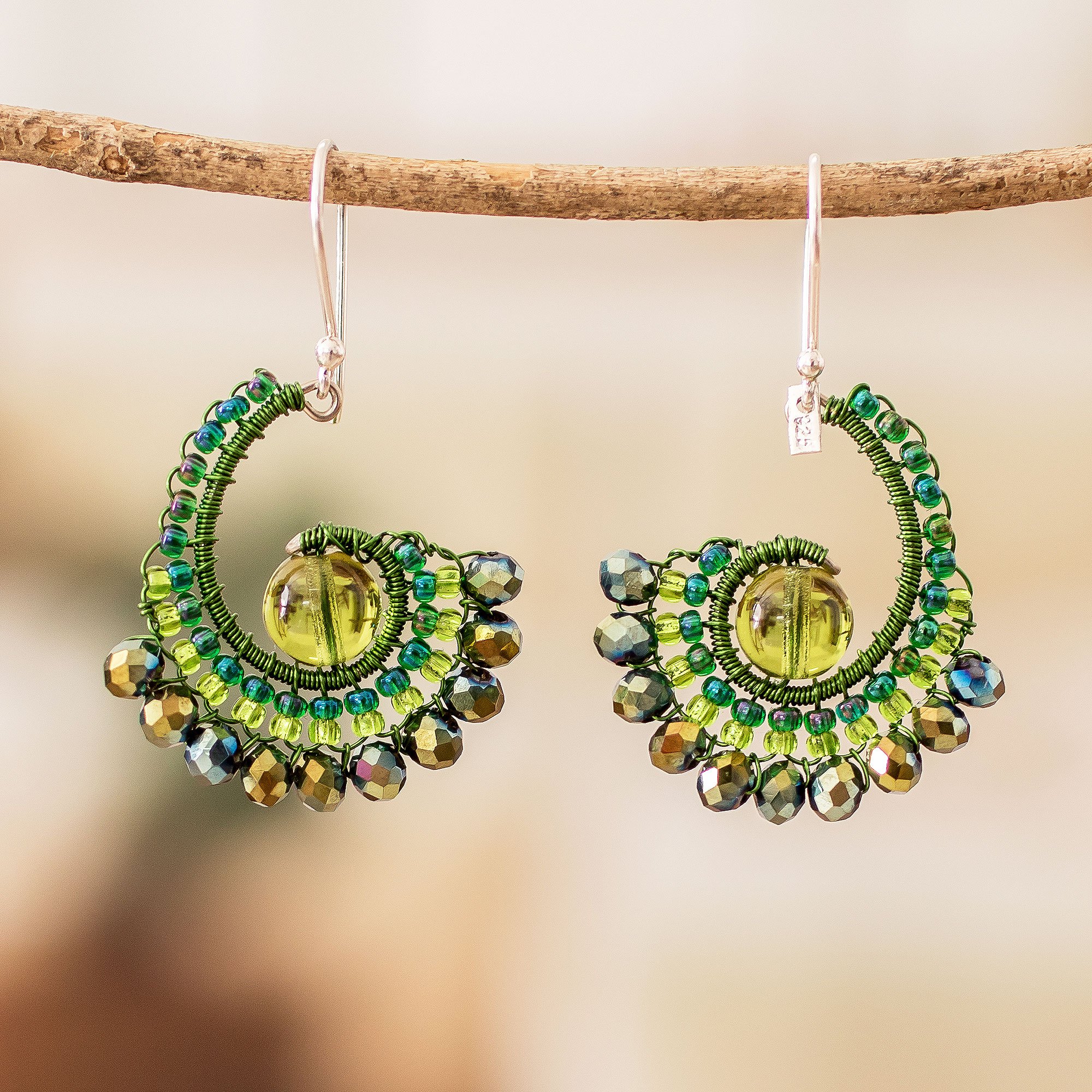 Fun and charming, these little tails shine with a gracious aura thanks to their hand-beaded design by Domingo Reanda. The Guatemalan artisan works on sinuous stainless steel structures, which he ornaments with crystal and glass beads in an enchanting palette of green and metallic hues. As the final touch, sterling silver hooks allow you to wear these dangle earrings in all their splendor.