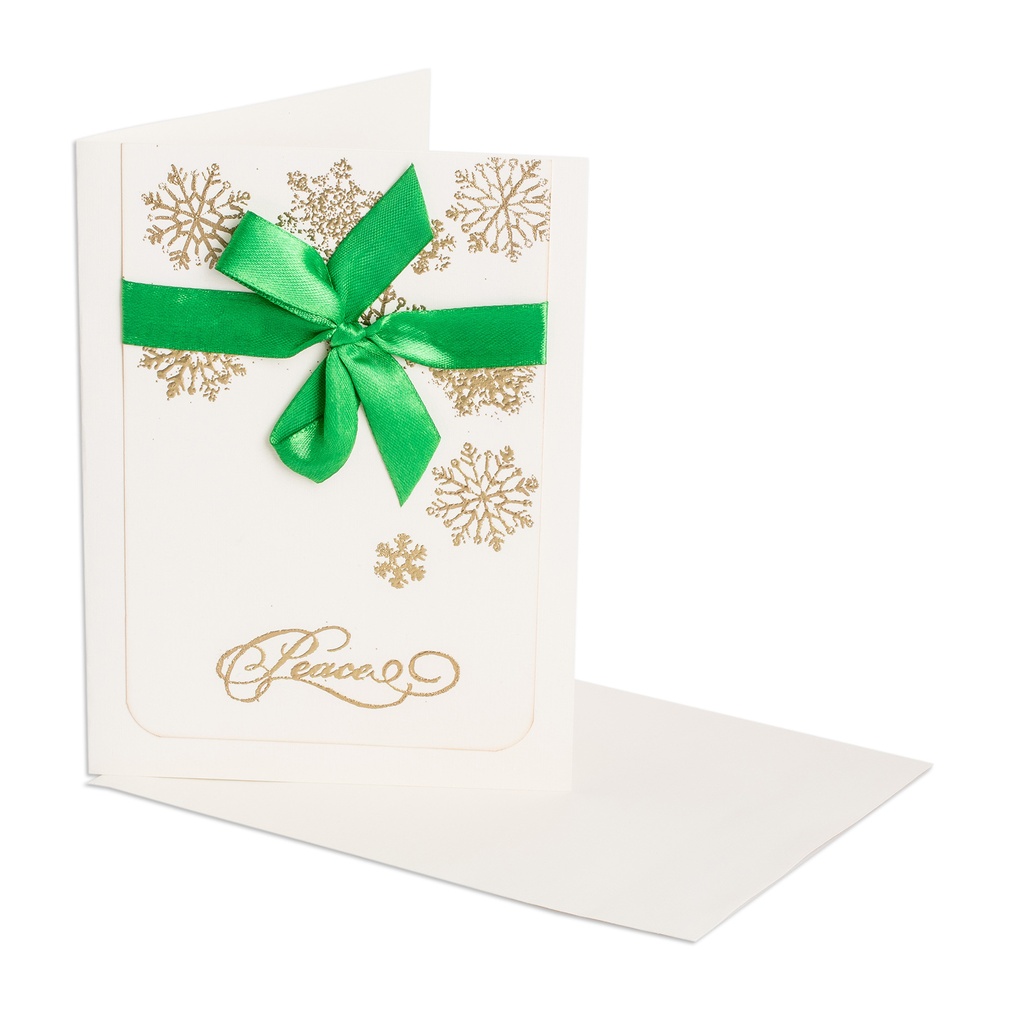 Golden snowflakes glisten with a message of peace in a set of greeting cards from Guatemala. Magdalena Women Artists craft each card by hand, featuring stenciled snowflakes and emerald green bows. The set of four blank cards includes the corresponding envelopes and is tied with a reed ribbon.
