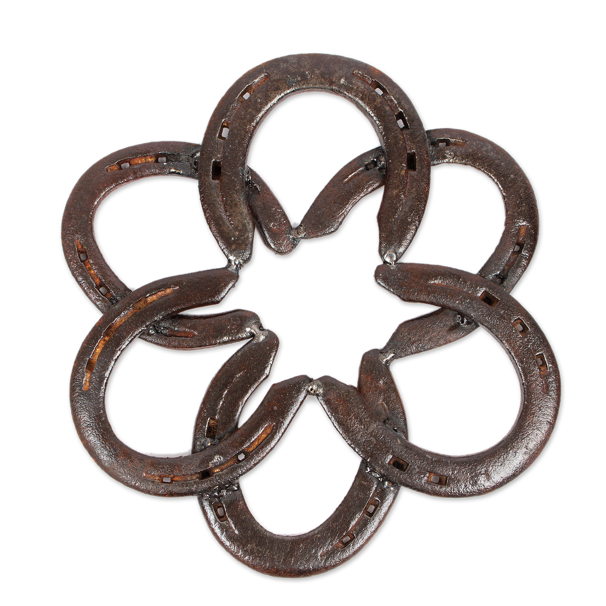 Forming a symmetrical circular design inspired by traditional mandalas, this wall sculpture is handcrafted of horseshoes. Ricardo Guerra creates this novel design for all lovers of horses and country life.