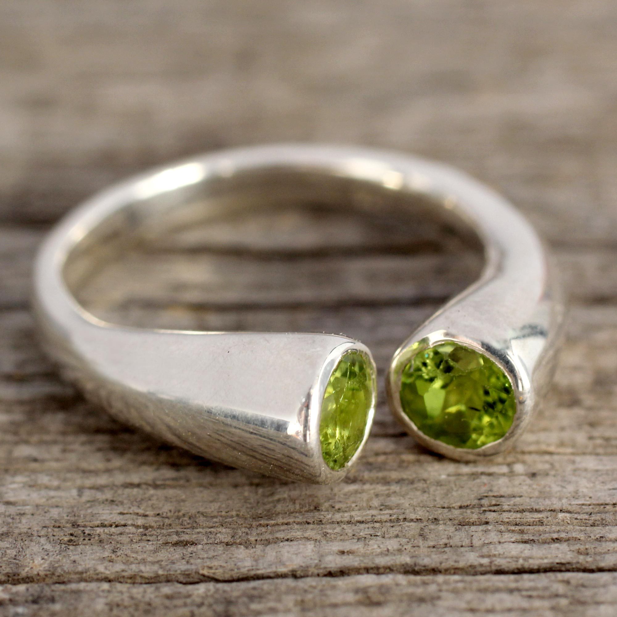 Forming a circle like endless love, peridot stones reach toward each other in a verdant gaze. Alok Jain presents them in sterling silver for an original and beautiful ring. The gems total 1.5 carats.