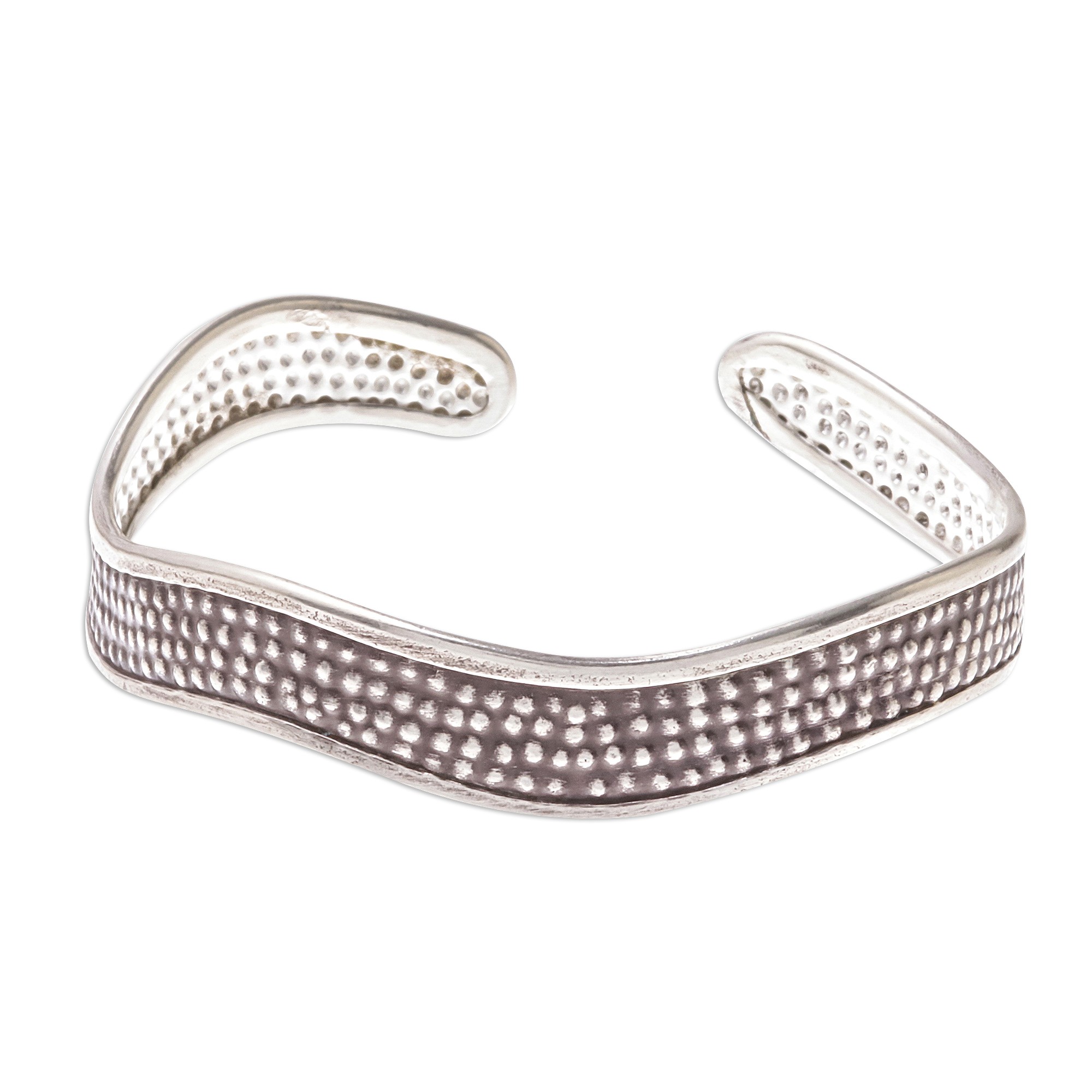 Achara of Thailand presents a cuff bracelet made of silver from the Karen hill tribe, a group of indigenous people in Thailand. The handcrafted bracelet is formed into an undulating wave and has a stippled finish, with each raised dot accentuated by the background oxidation.