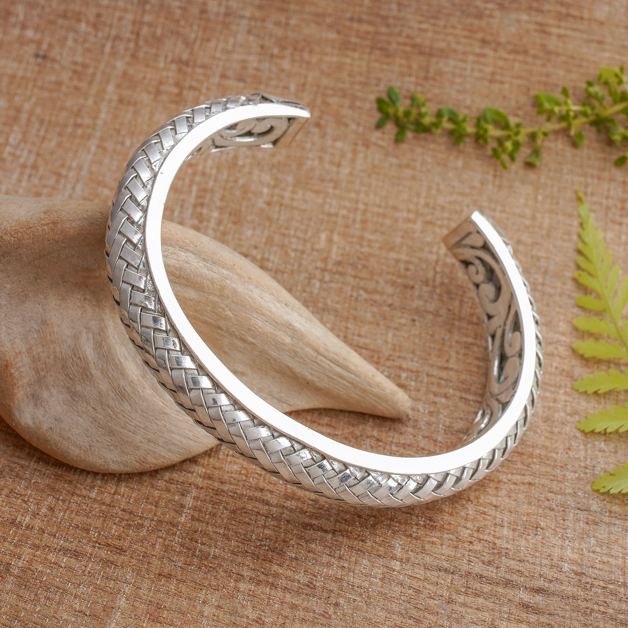 Komang Suastra of Indonesia handcrafts this striking cuff bracelet. Using sterling silver strands, the Balinese artisan creates a woven design on the exterior and a swirling vine pattern on the inner surface. Unique and classy, the bracelet will add an exotic flavor to your collection.
