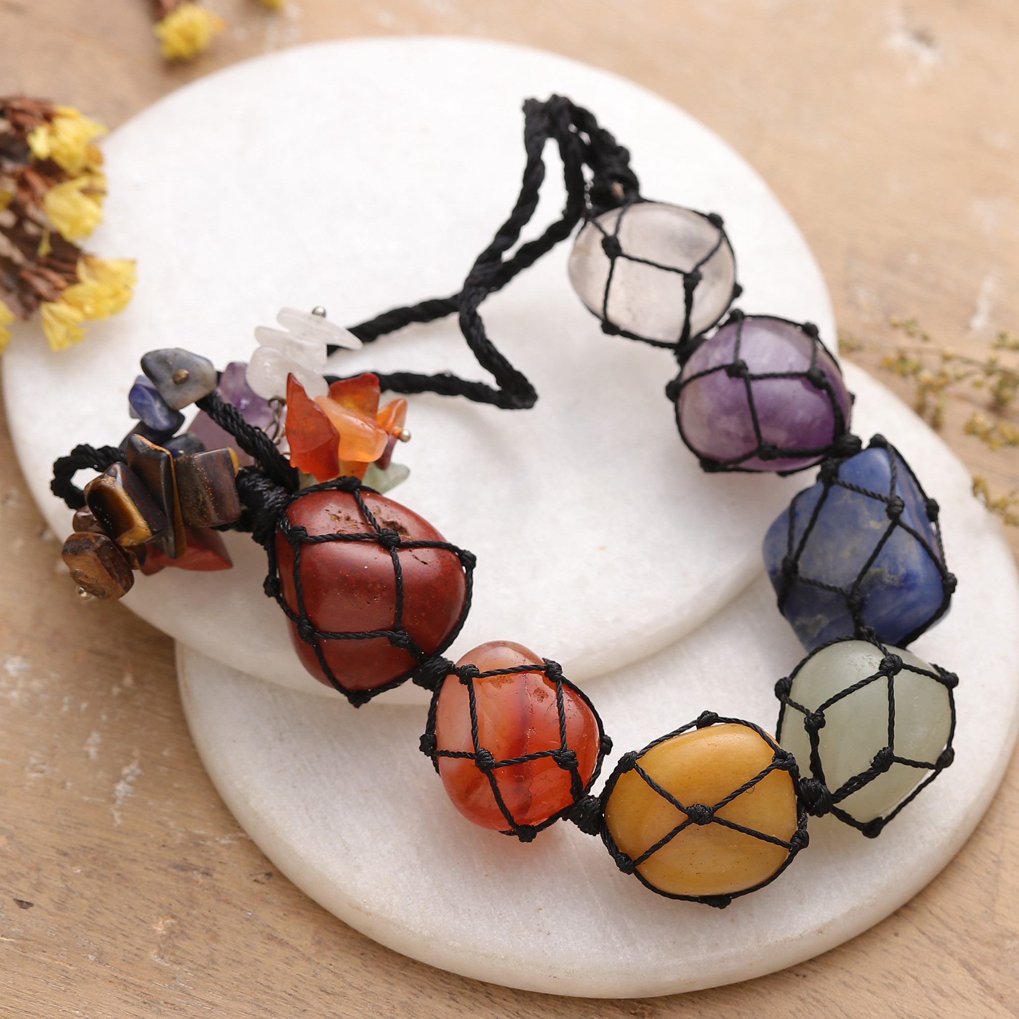 Precious elements of Earth reunite to open a portal to the universe's sacred energy center. Inspired by the chakra doctrine, designer Swasti Jain and a talented team of Indian artisans work with meticulous dedication in this car charm made of black cotton cords that gently embrace gems of amethyst, quartz, lapis lazuli, aventurine, jade, carnelian and jasper—each jewel representing a chakra energy center.