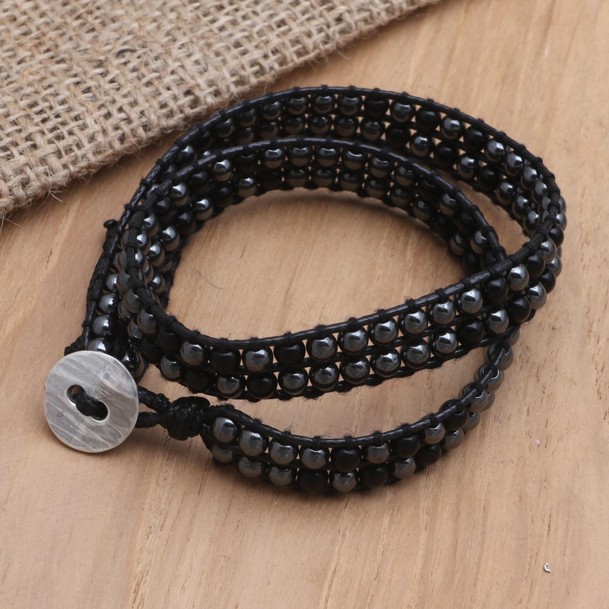 Handcrafted Onyx and Hematite Wrap Bracelet, 'Dark Hour'