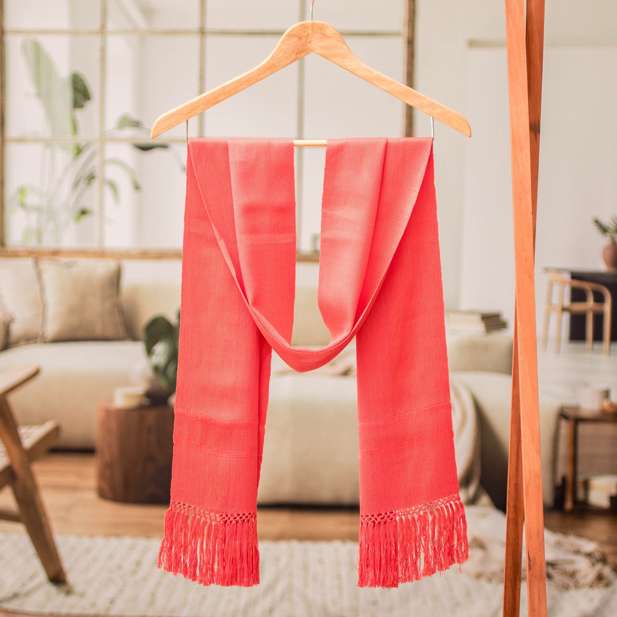 This stunning rayon scarf tells a story with every fiber, brought to life through the expert hands of Guatemala's Ranm Ixoqi' female artisans. The stunning combination of orange and pink catches the eye while the joyful fringe detail adds a rhythmic finishing touch. Whether paired with casual denim or an evening ensemble, this hand-woven beauty brings a touch of Guatemalan artistry to your personal style narrative.