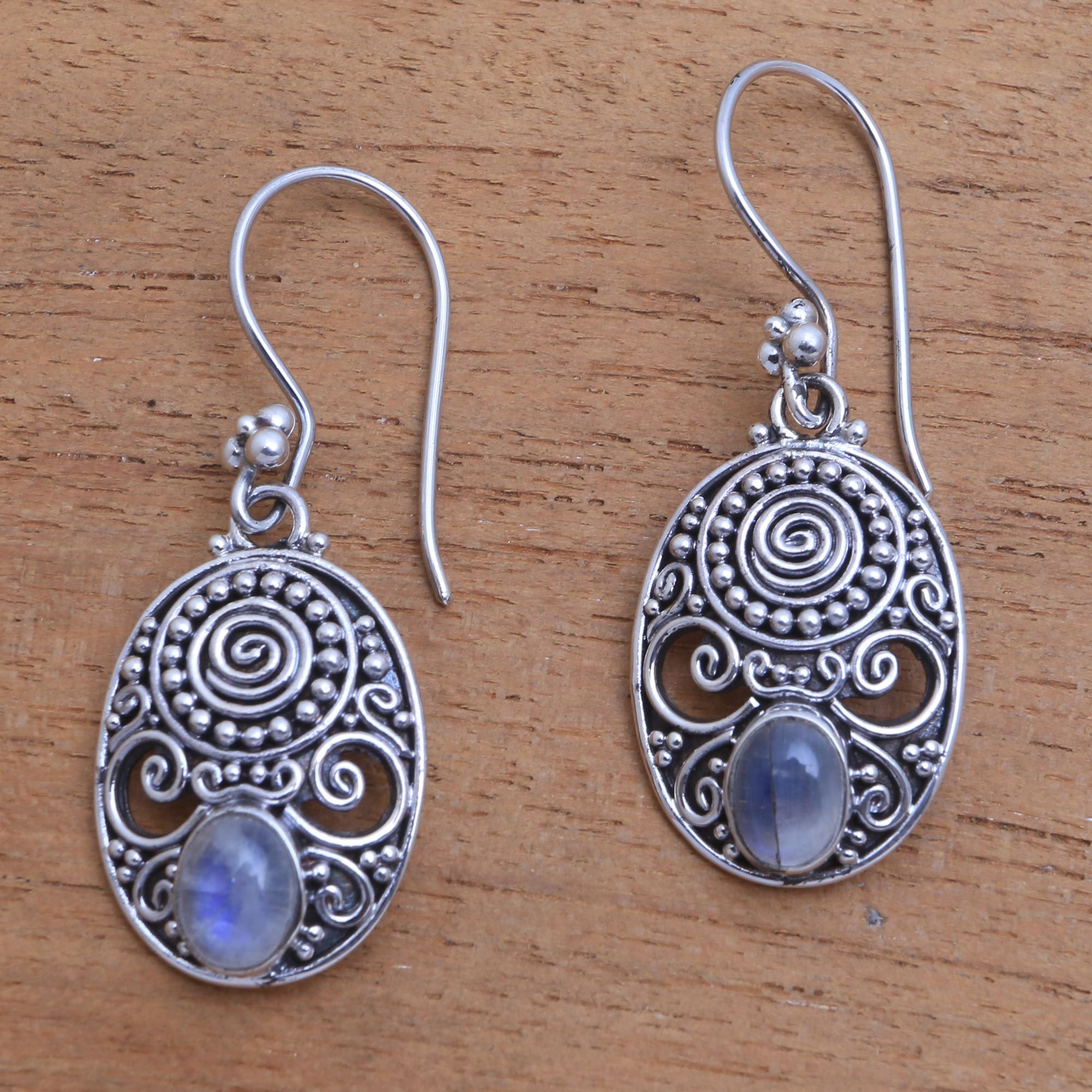 Designed by Balinese artisan Buana, this pair of dangle earrings evokes the supreme beauty of the gods. Each oval earring is handcrafted of sterling silver, featuring a spiral motif at the top that is accentuated by dot and openwork wire motifs. An oval cabochon of rainbow moonstone completes each piece.
