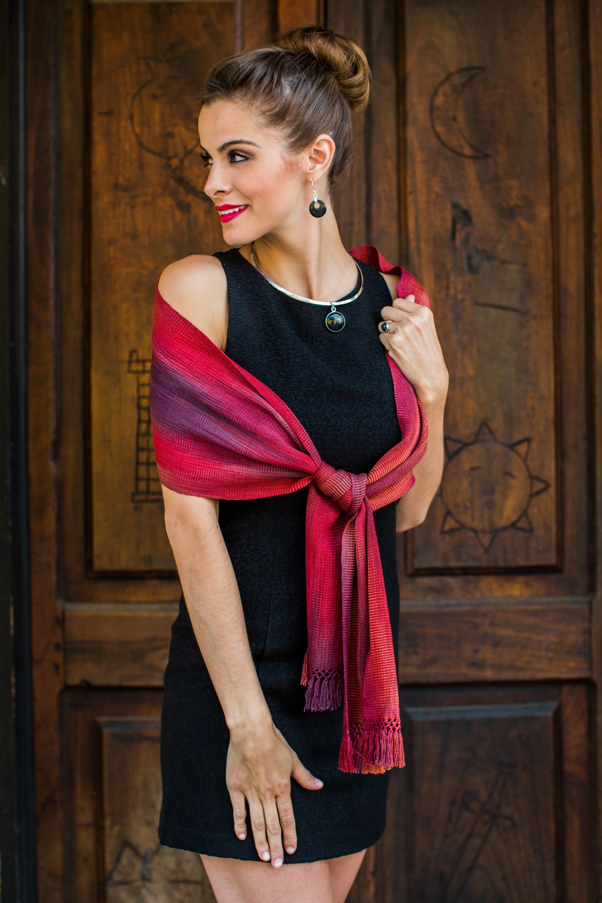 Talented weavers from K'amolon K'i K'ojonel create an admirable iridescent effect as they weave this scarf on a traditional backstrap loom. Working with rayon made from bamboo fiber, they weave this scarf in shades of red, orange, yellow and maroon.