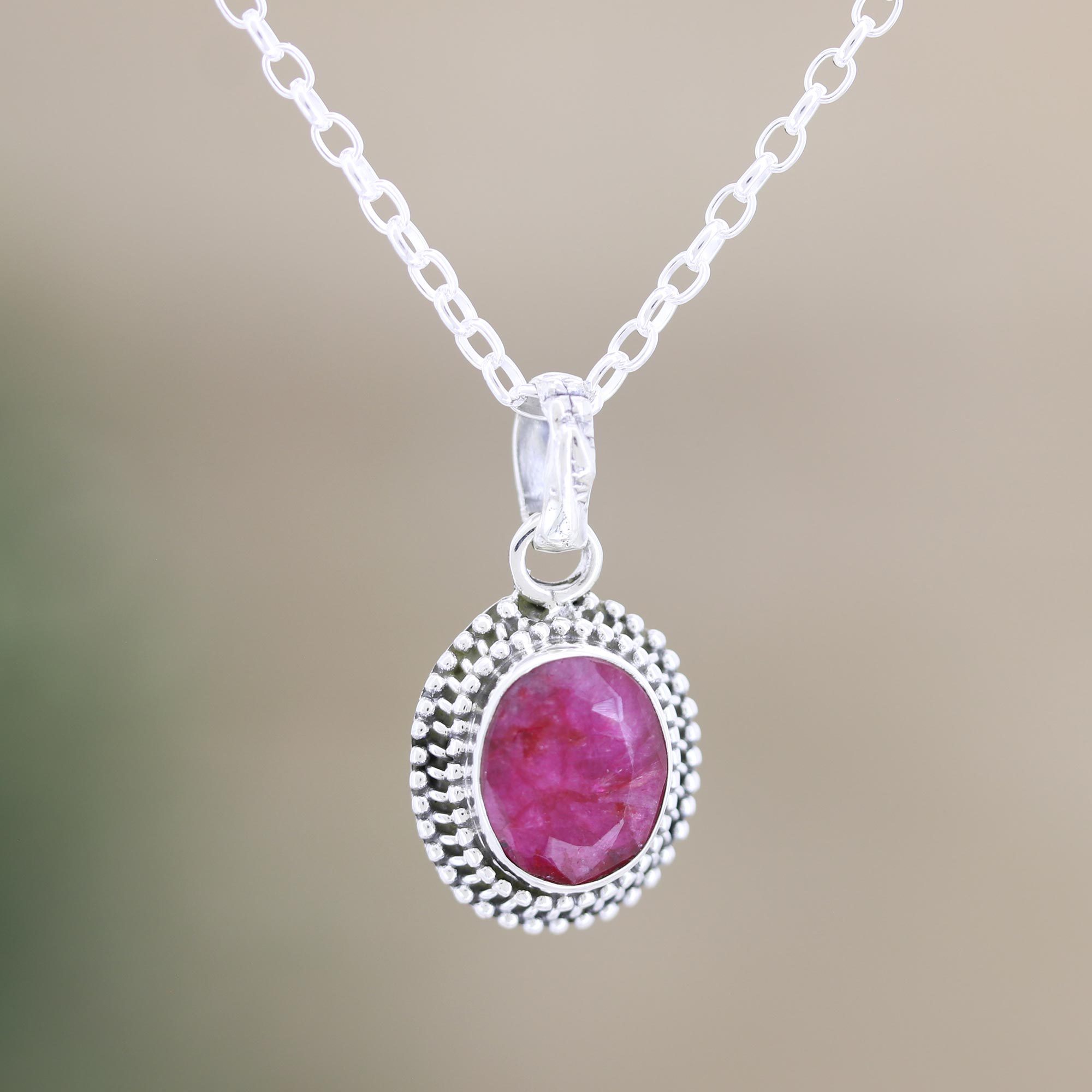 Framed in decorative silver, the pink gemstone on Bhavya Jain's pendant necklace glows with intensely passionate color. Indian artisans use sterling silver to diligently handcraft the necklace, suspending a four-carat faceted ruby from a delicate cable chain.