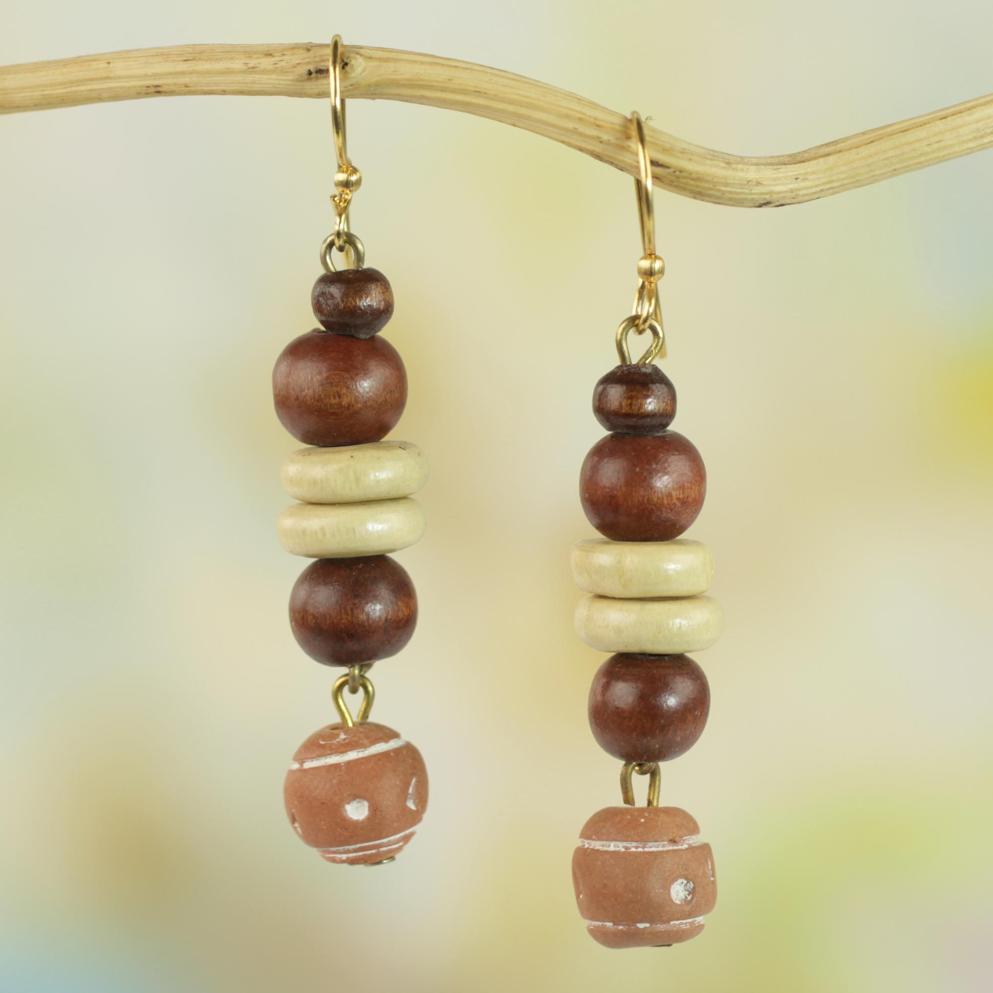 Handcrafted Sese Wood and Ceramic Earrings from Ghana, 'Remembrance Beads'