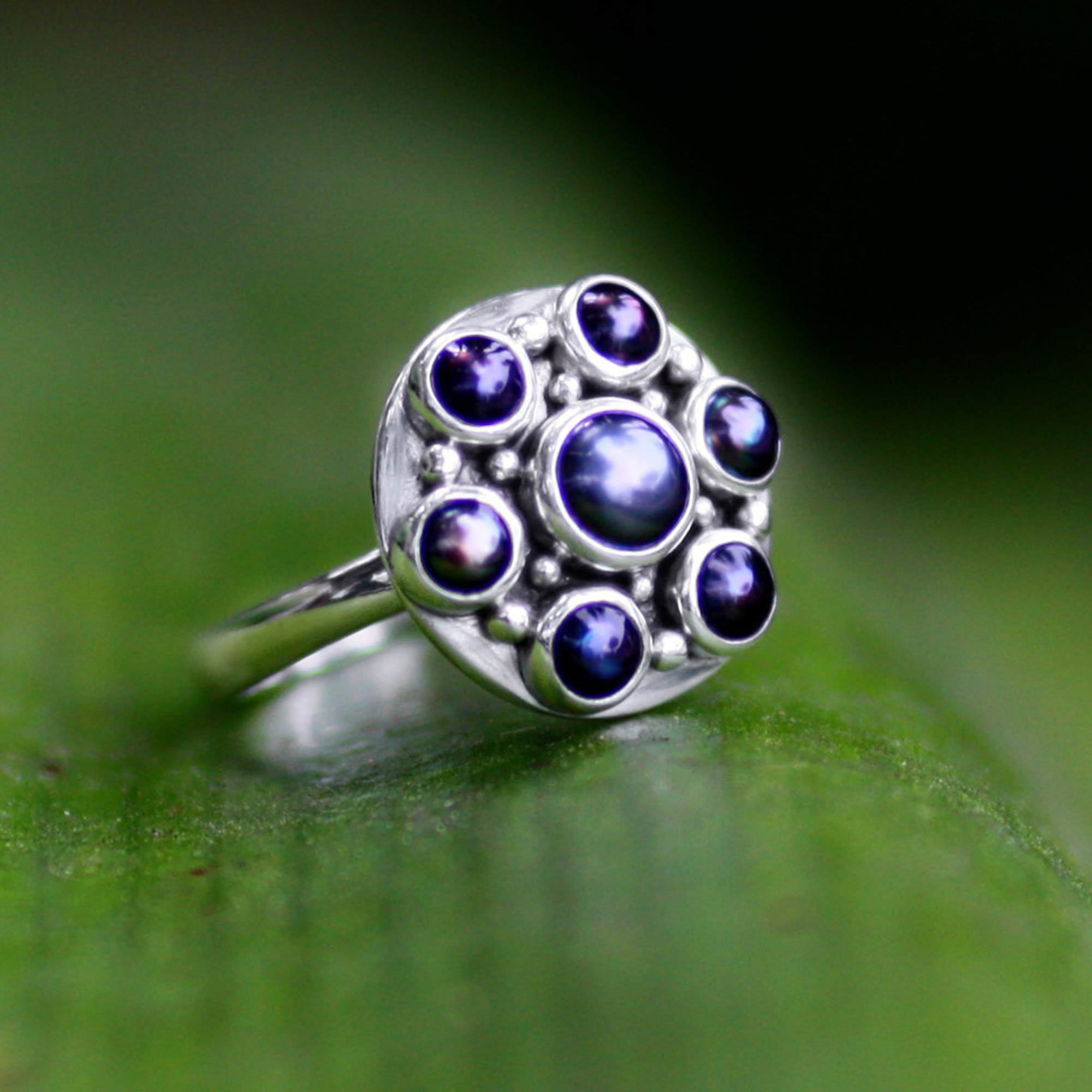 Handcrafted Silver and Pearl Flower Ring, 'Black Rose'