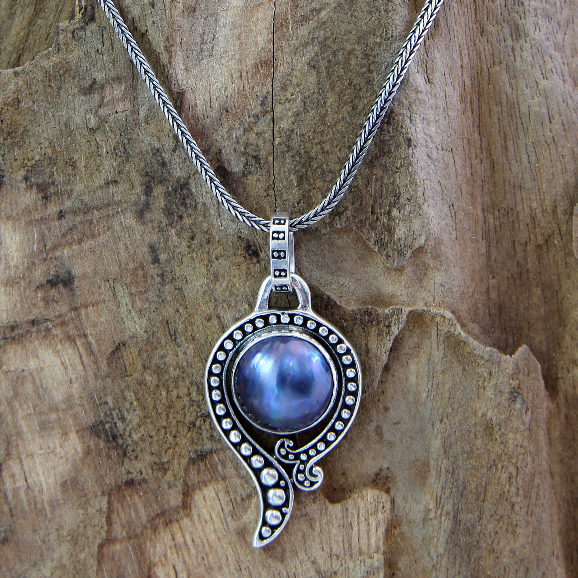 A tiara of sterling silver embraces a luminous blue pearl, the June birthstone, as though catching a bit of the heavens. Hand crafted by Kenari, the lovely necklace is gracefully feminine.