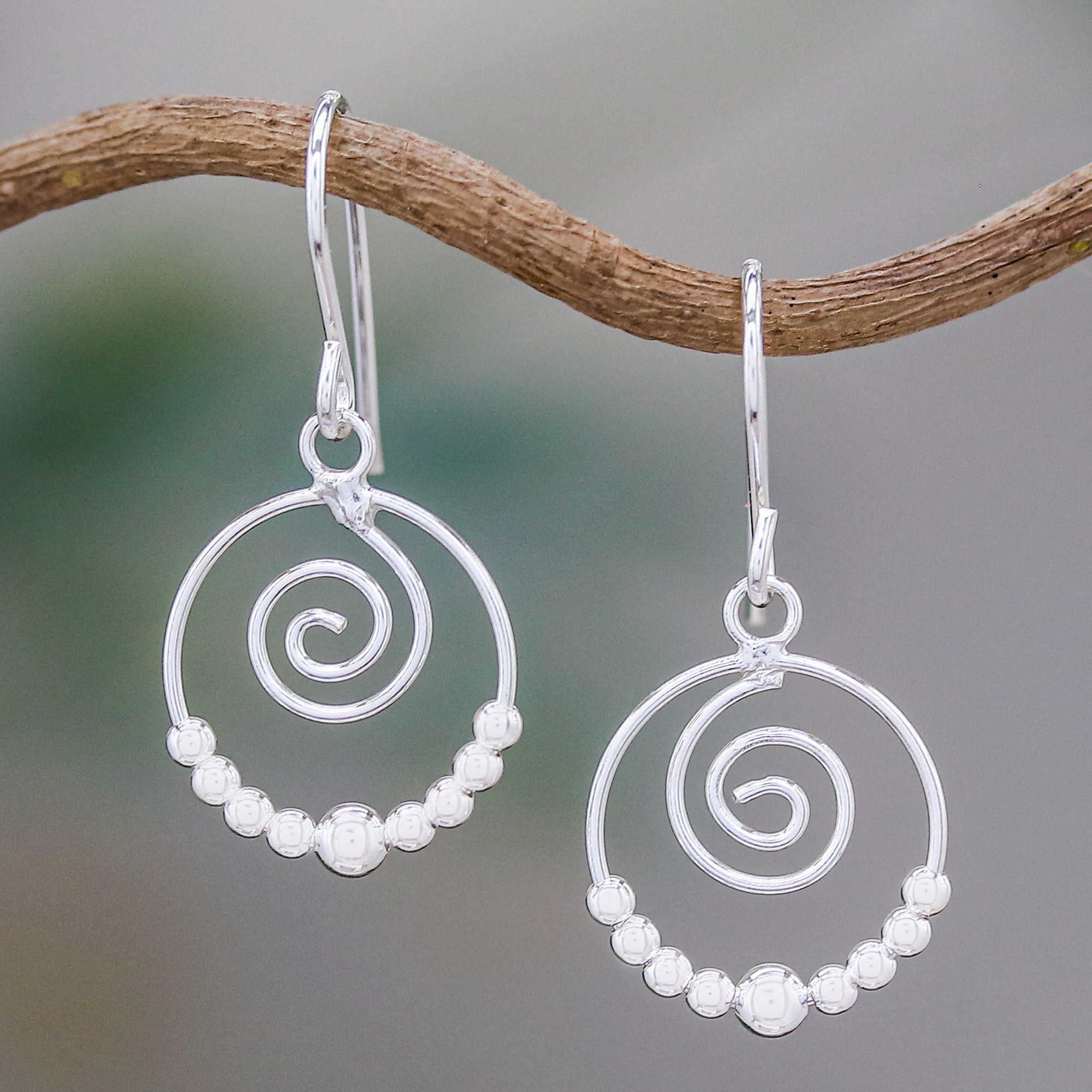 Mesmerizing spirals center these dangle earrings from Thailand's Aoy. The spirals are suspended above globes of highly polished sterling silver, resulting in an earring with contemporary flair and dynamic energy.
