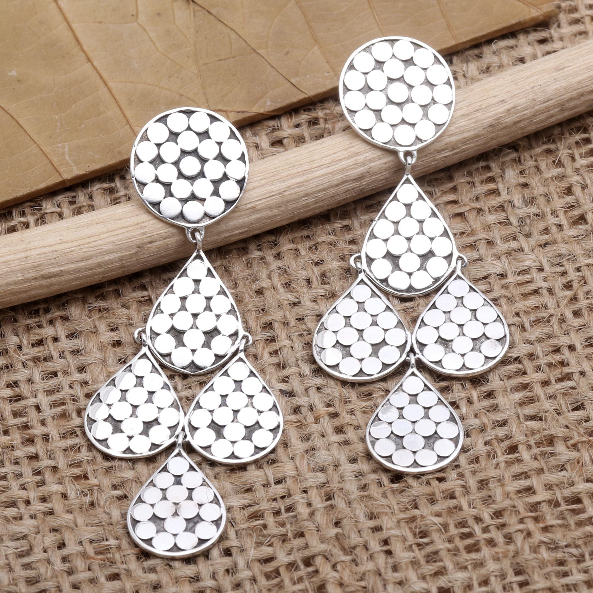 A beautiful dot motif and dangling pear shapes turn Nyoman Ariawan's dangle earrings into a cascading waterfall of shining silver. The Balinese artisan hand crafts each earrings from a quartet of sterling silver pear shapes, filling the drops with polished silver designs.
