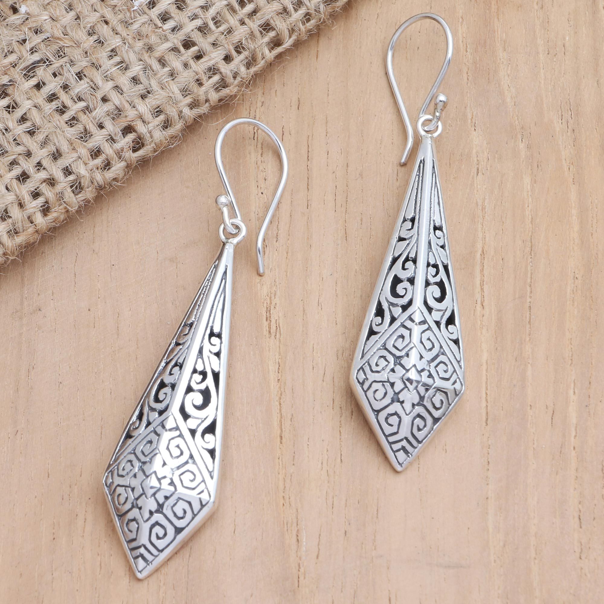 Engraved with geometric designs, Dewa Arimbawa's elegant dangle earrings are shaped like a men's tie. The Balinese artisan hand crafts the earrings from sterling silver, engraving the precious metal with openwork and oxidized designs.