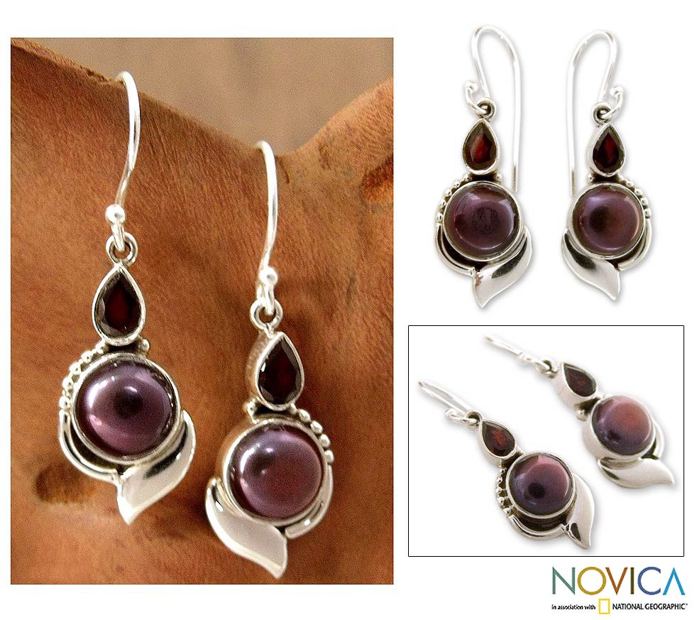 Handcrafted Sterling Silver Garnet and Pearl Earrings, 'Modern Romance'