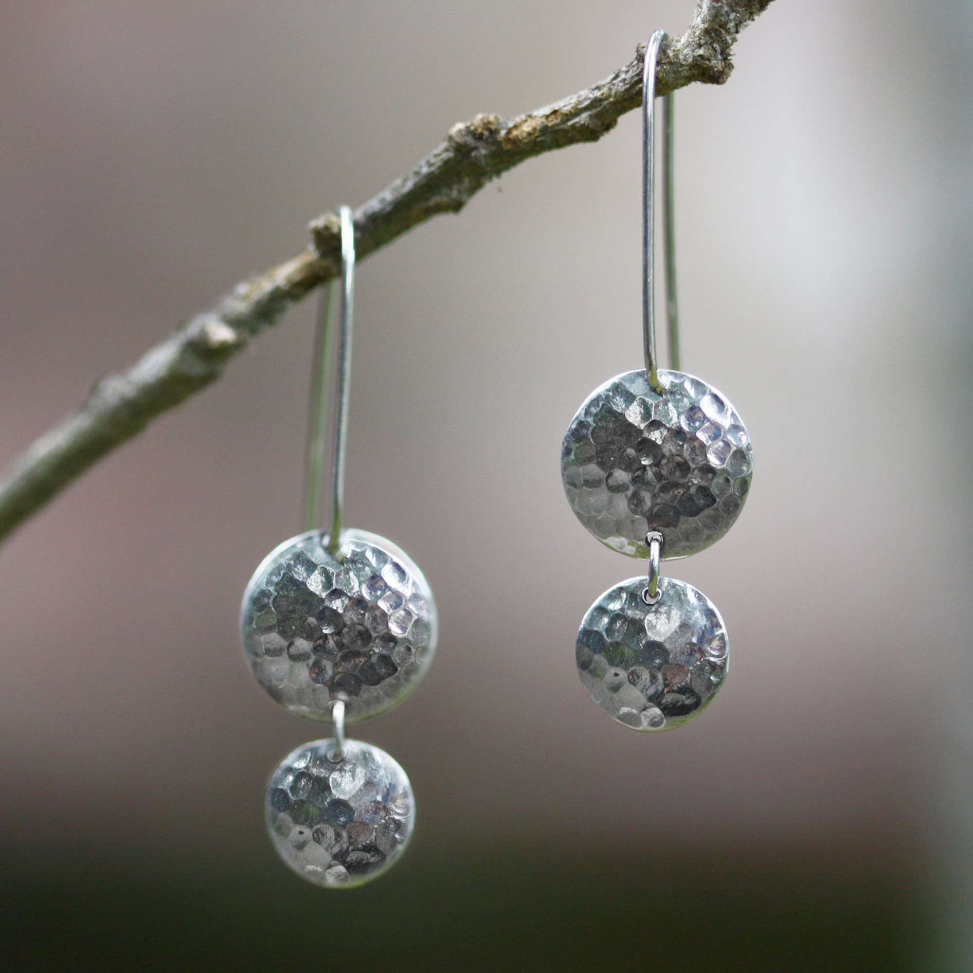 Modern, yet classic, these sterling silver earrings are reminiscent of a shimmering Faerie Mirror. Using traditional silversmith techniques, Indonesian artist Nyoman Rena hammers the silver by hand, creating the sweet and delicate discs. These expertly crafted dangle earrings will be the perfect addition to your collection.
