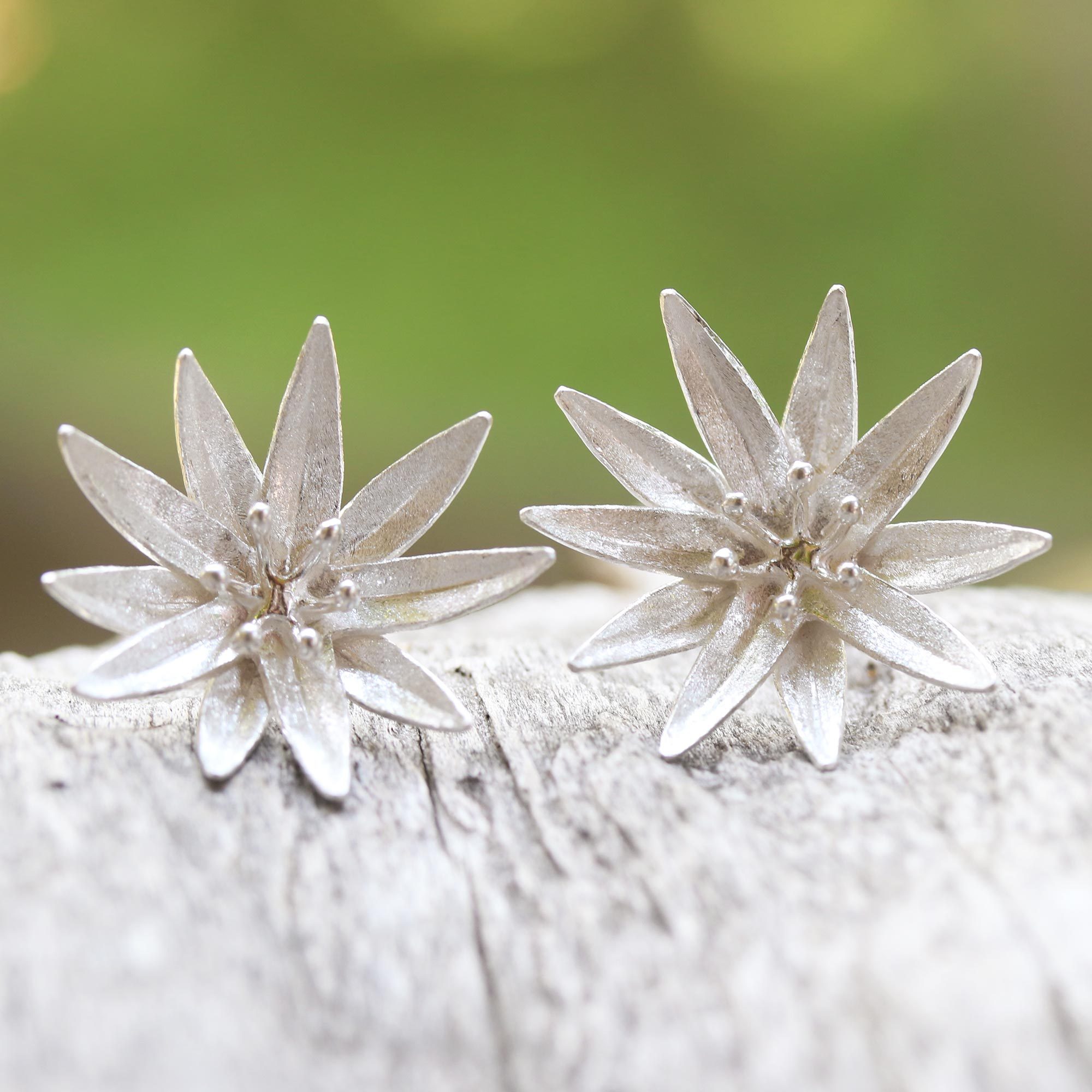 Lifting radiant petals from a lily pond, lotus blossoms look toward the sun. The lotus is considered one of Buddha's favorite offerings, as it is a symbol of purity, arising unsullied from muddy ponds. Desi Antari creates the lovely flowers as sterling silver earrings.