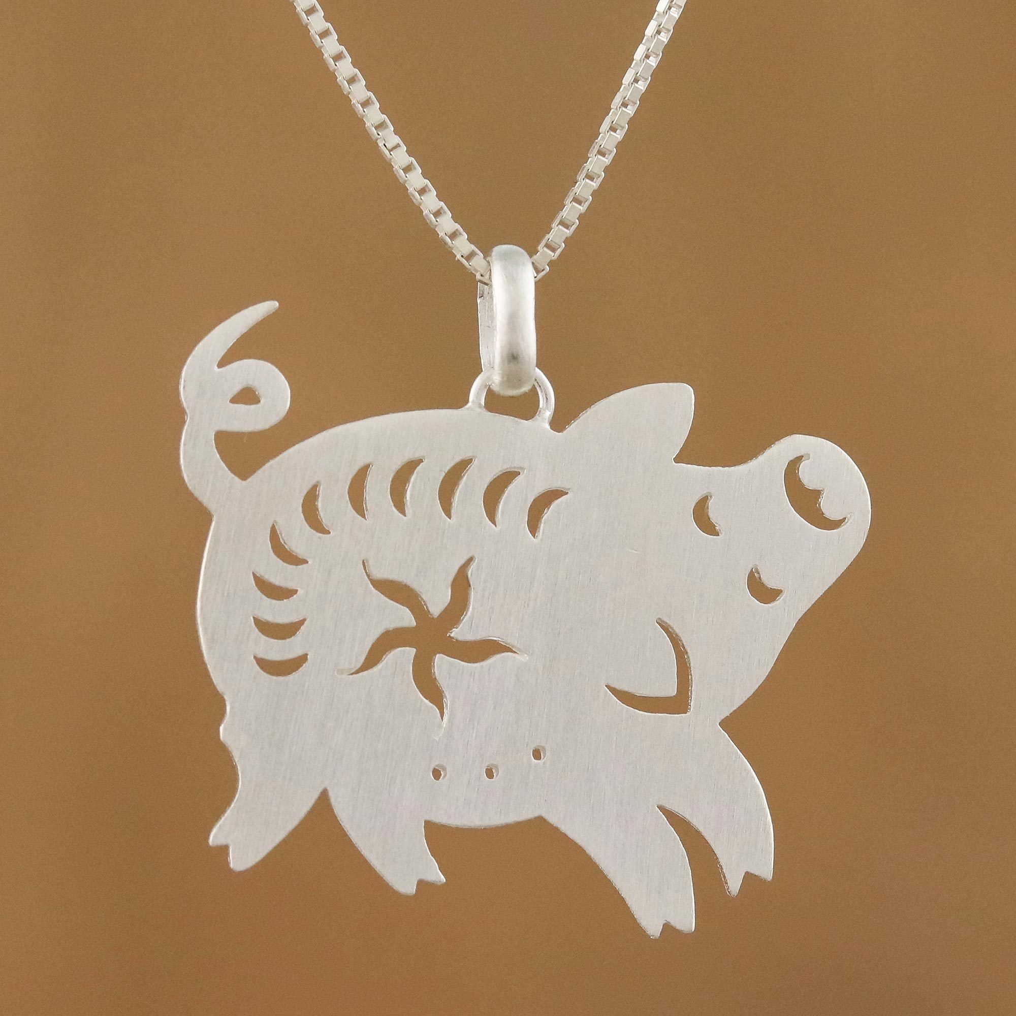 Handcrafted Sterling Silver Pig Pendant Necklace, 'Silver Zodiac Pig'