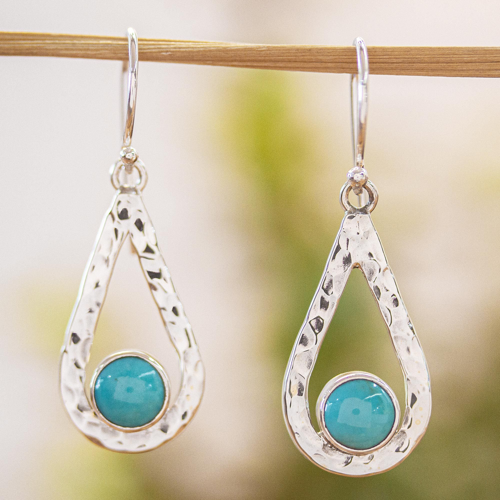 Centering textured silver raindrops, natural turquoise evokes blue water. Alon Diller crafts these delightful dangle earrings by hand.