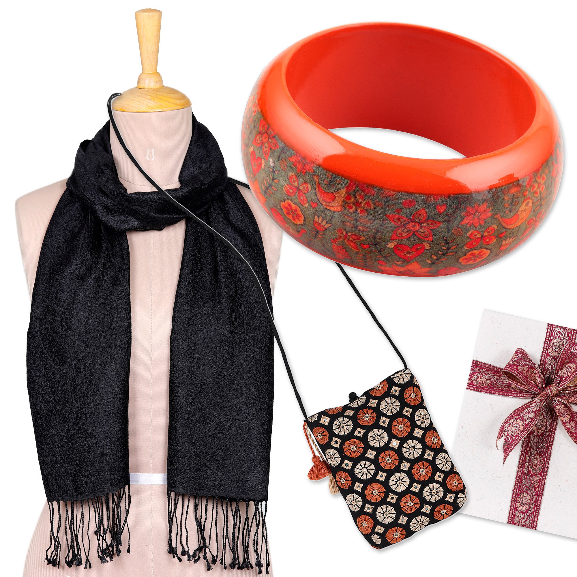 Conquer those casual or formal sunset events with a stylish ensemble from India. NOVICA's curated gift set selects the best of artisans from the SEWA Association, Sandeep Malhotra and Vipin, allowing for a charming box of exquisite designs. A 100% cotton sling featuring a palette of black, brown and ivory hues comes equipped with a button closure and a comfortable strap, all beautifully complemented by a 100% silk black scarf of soft texture and a classic Haldu wood bangle bracelet accented with a natural scene around the structure.