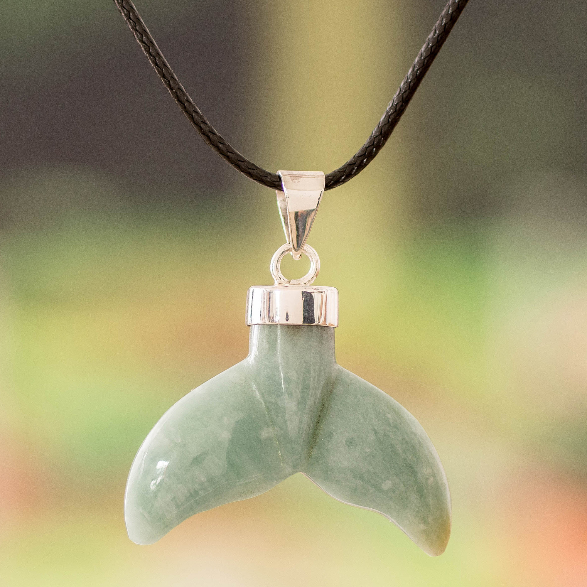 Explore the waves of life with these light green jade fins of joyous energy. Guatemala's Ruben and Gilda Perez evoke the soul of the ocean in this pendant necklace, whose hand-carved gem assumes the shape of a whale tail—accented with sterling silver details and a waxed cotton cord.